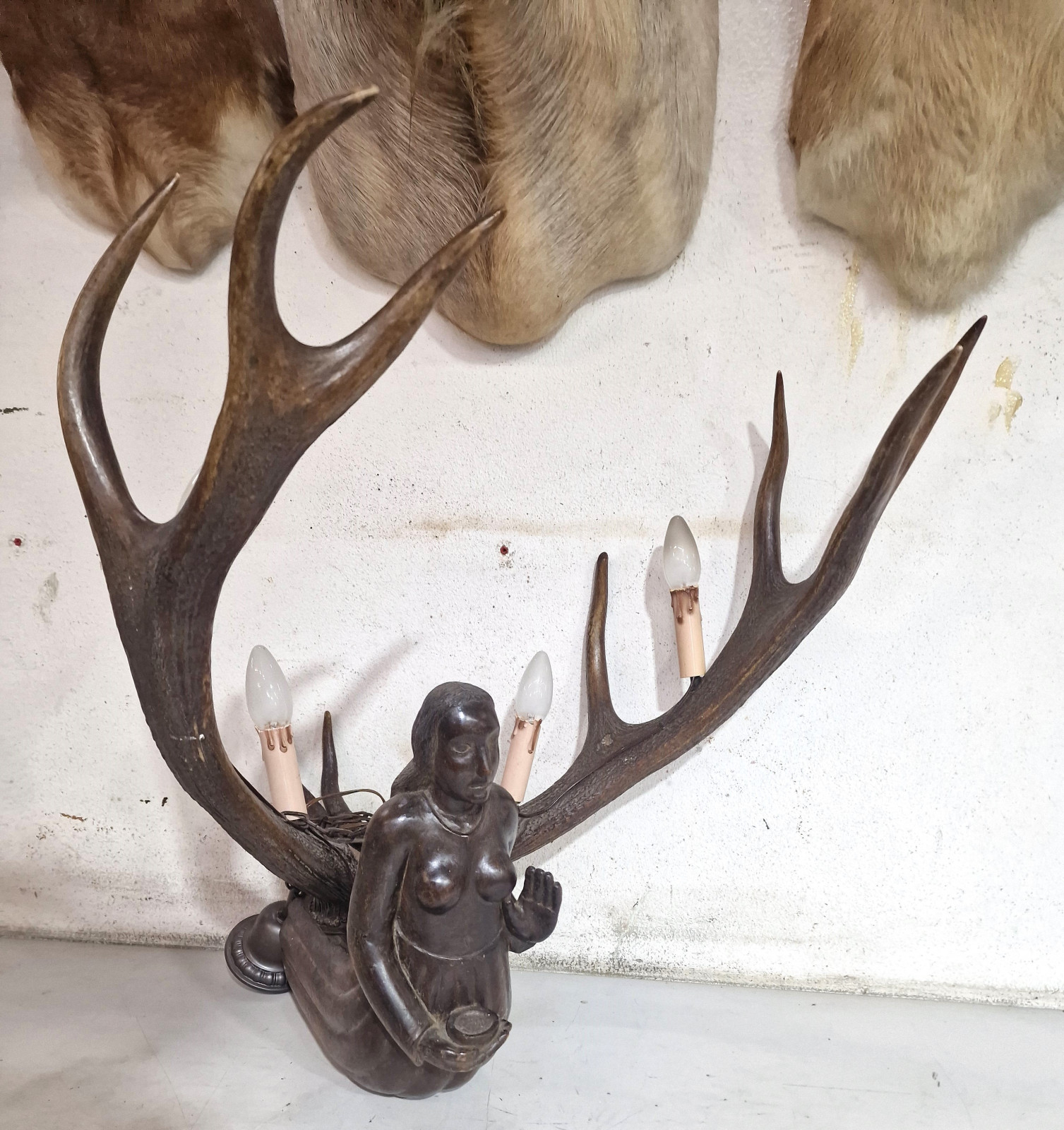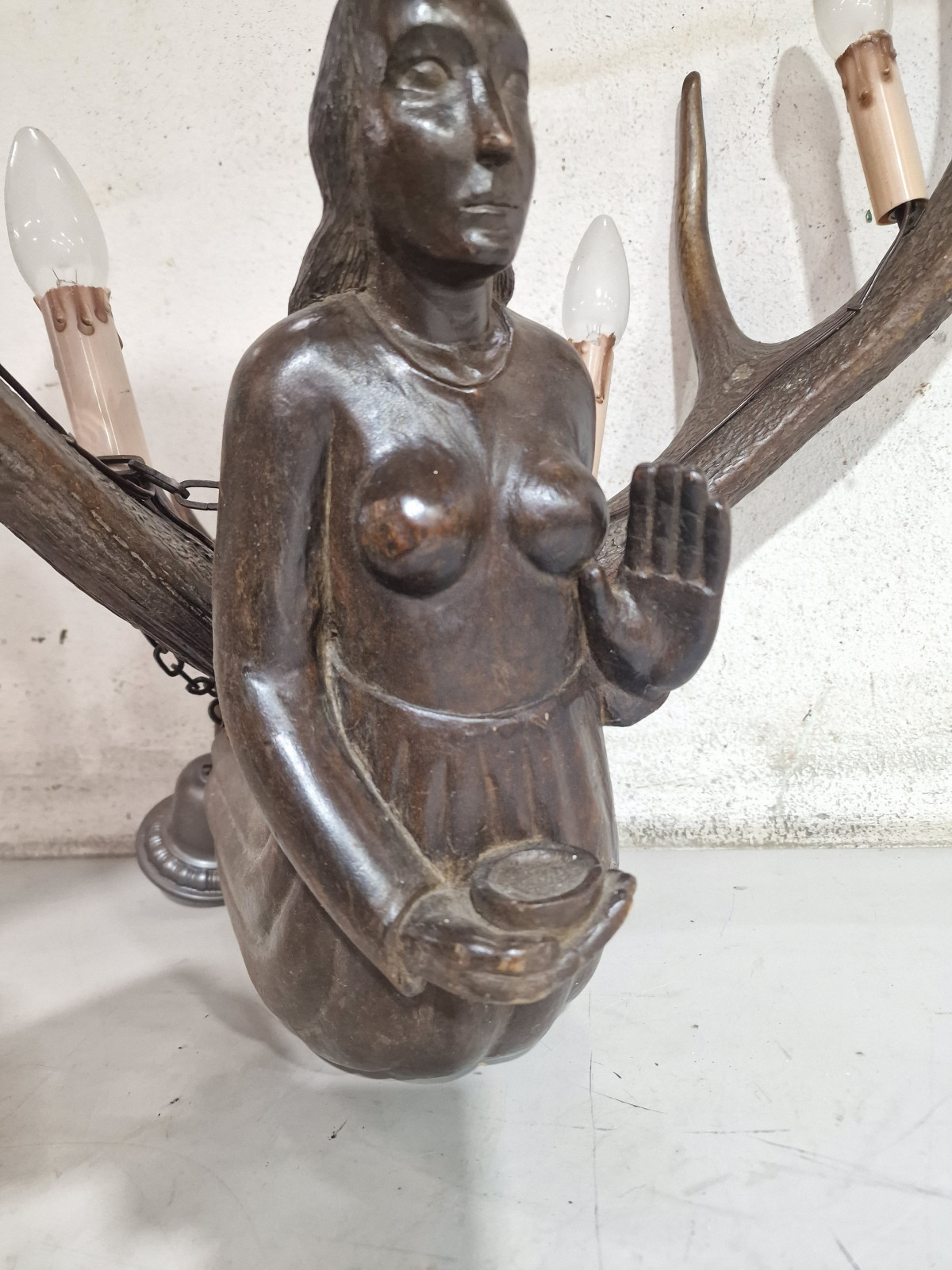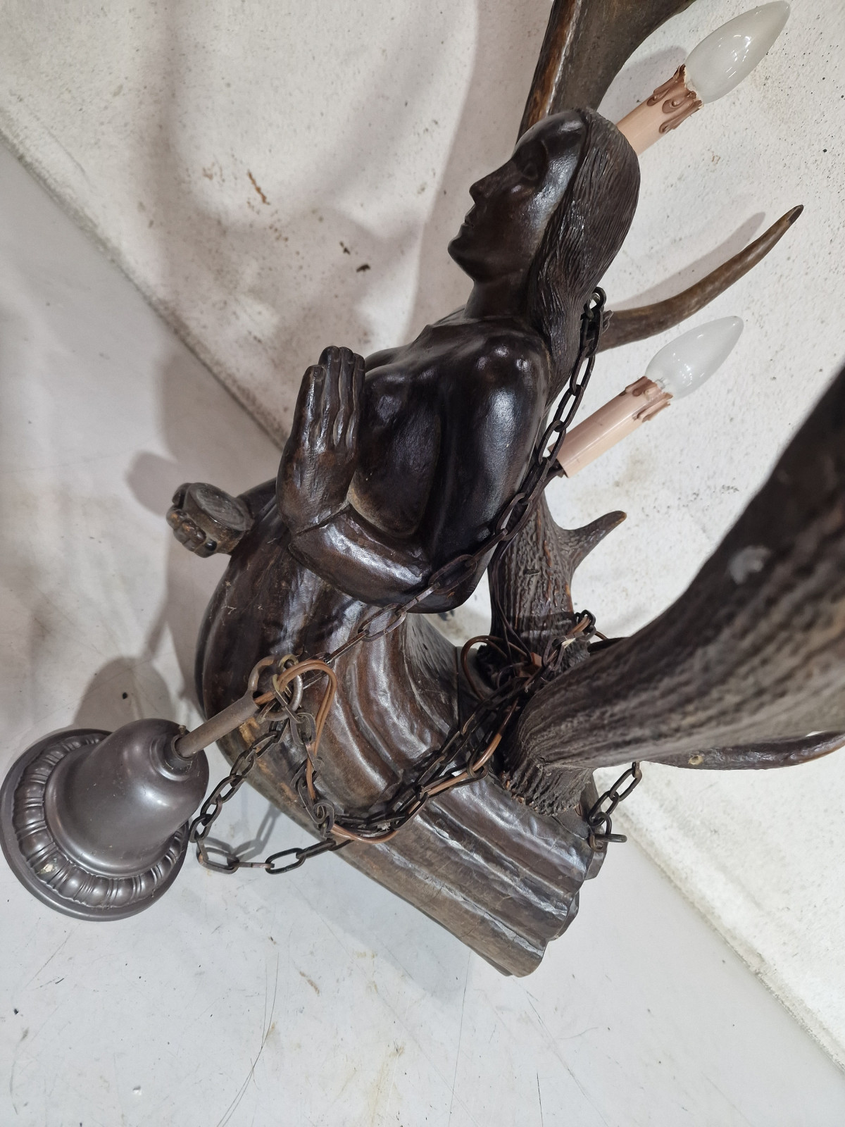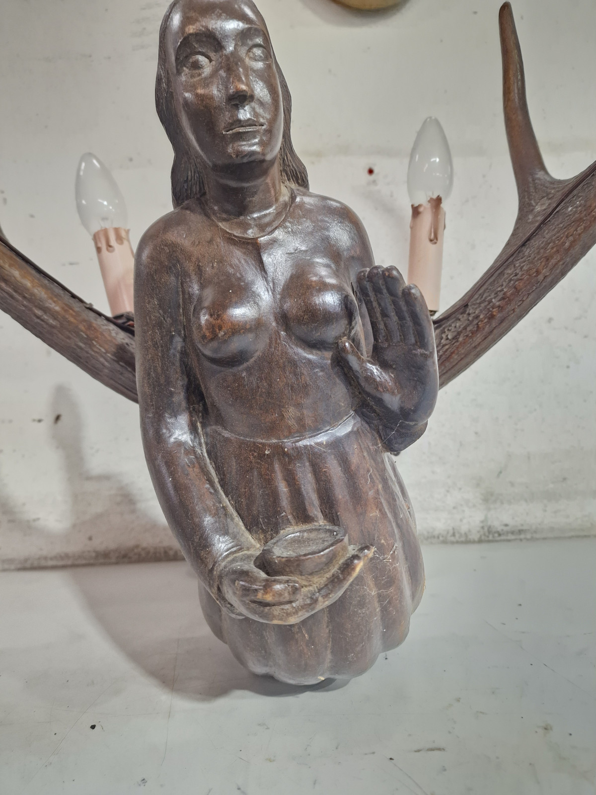 aufwendig von unbekanntem Künstler aus 2 kapitalen Rothirsch Abwurfstangen gefertigt mit detailreicher Holzarbeit in Form einer knieenden Frau in der rechten Hand mit kleiner Ablage zur Aufstellung einer Kerze