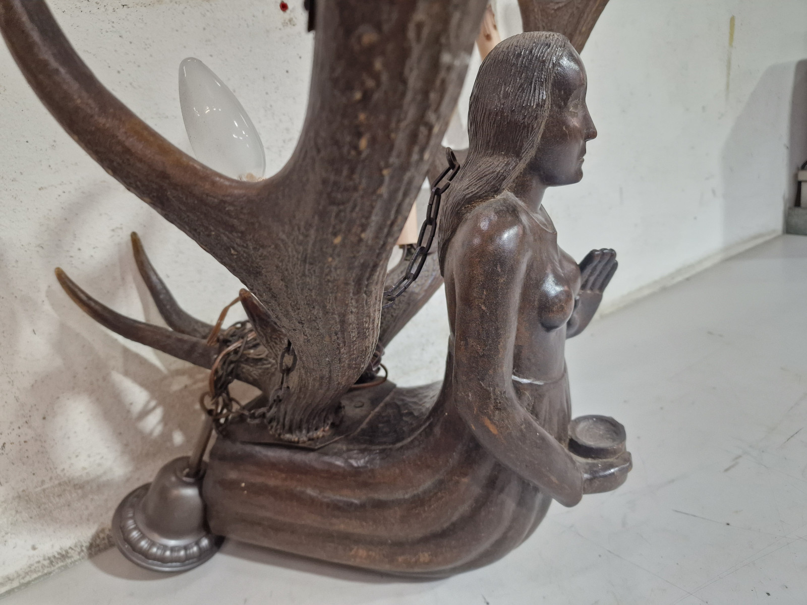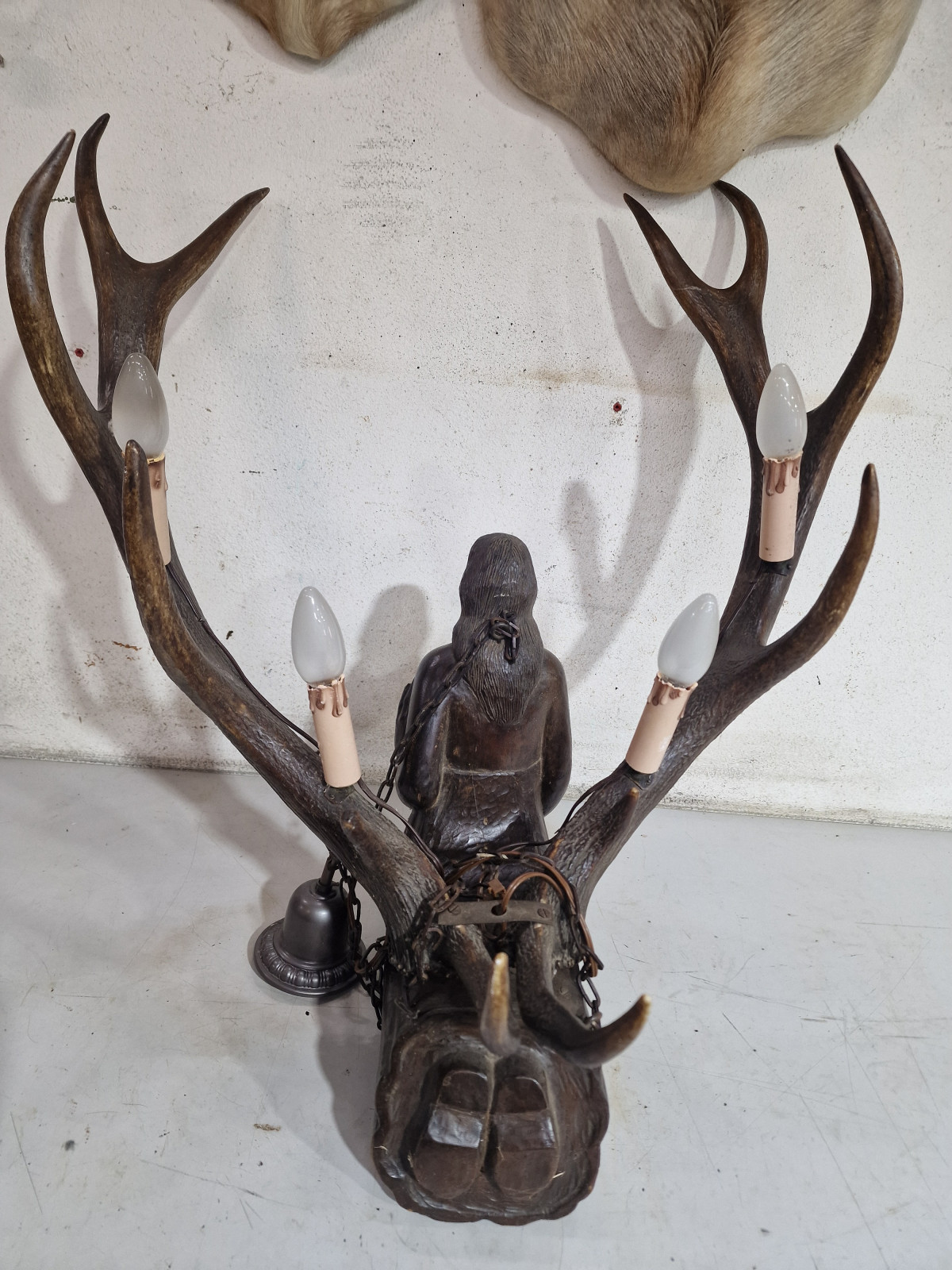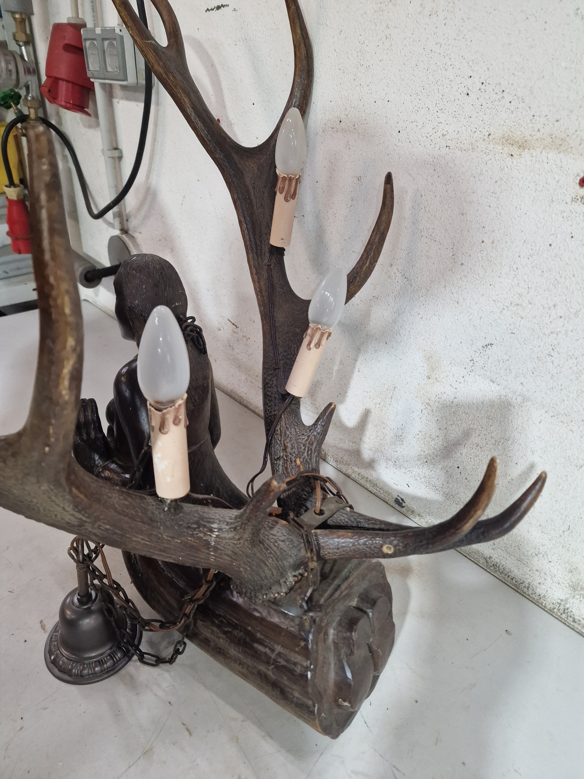 aufwendig von unbekanntem Künstler aus 2 kapitalen Rothirsch Abwurfstangen gefertigt mit detailreicher Holzarbeit in Form einer knieenden Frau in der rechten Hand mit kleiner Ablage zur Aufstellung einer Kerze