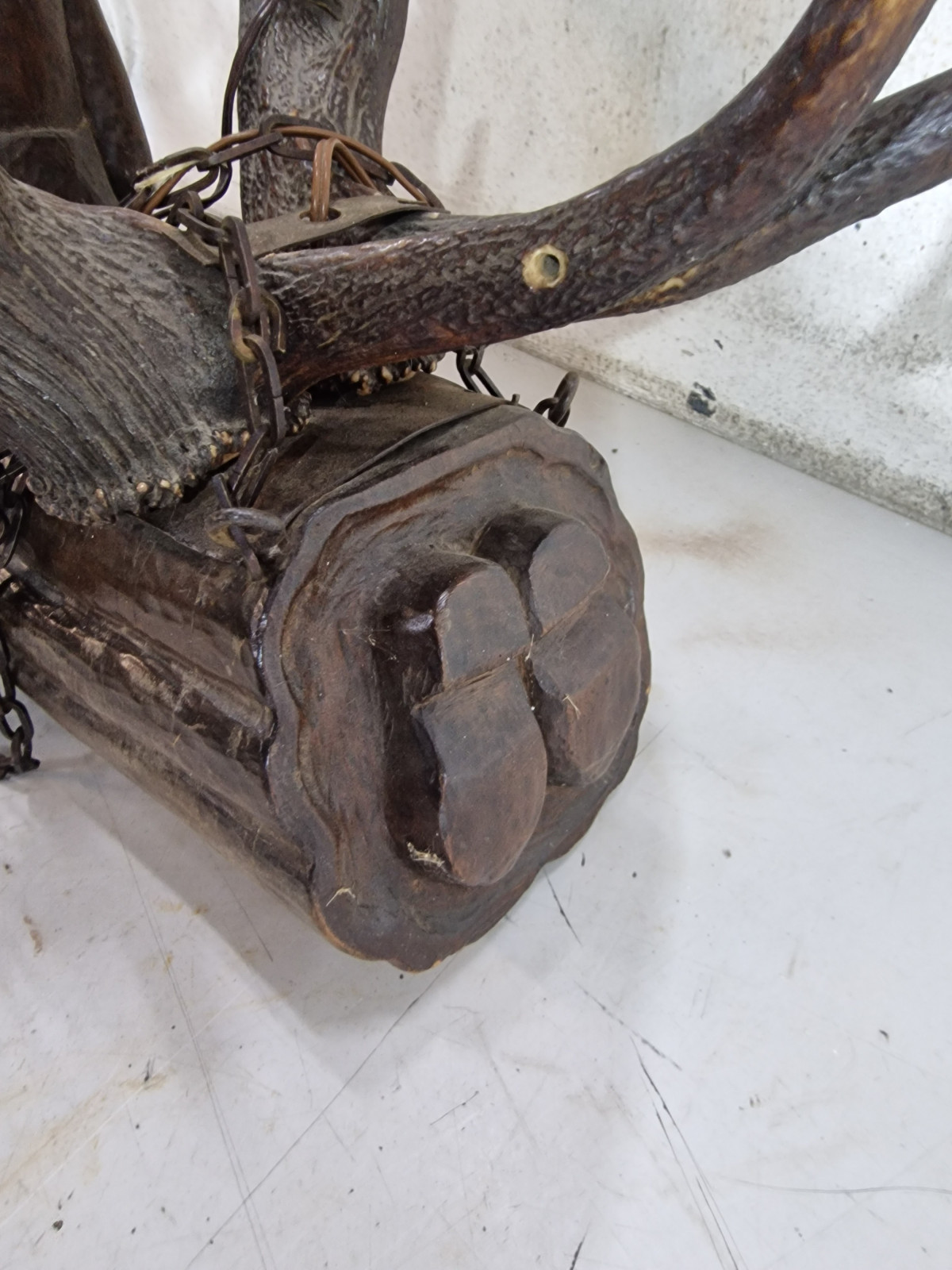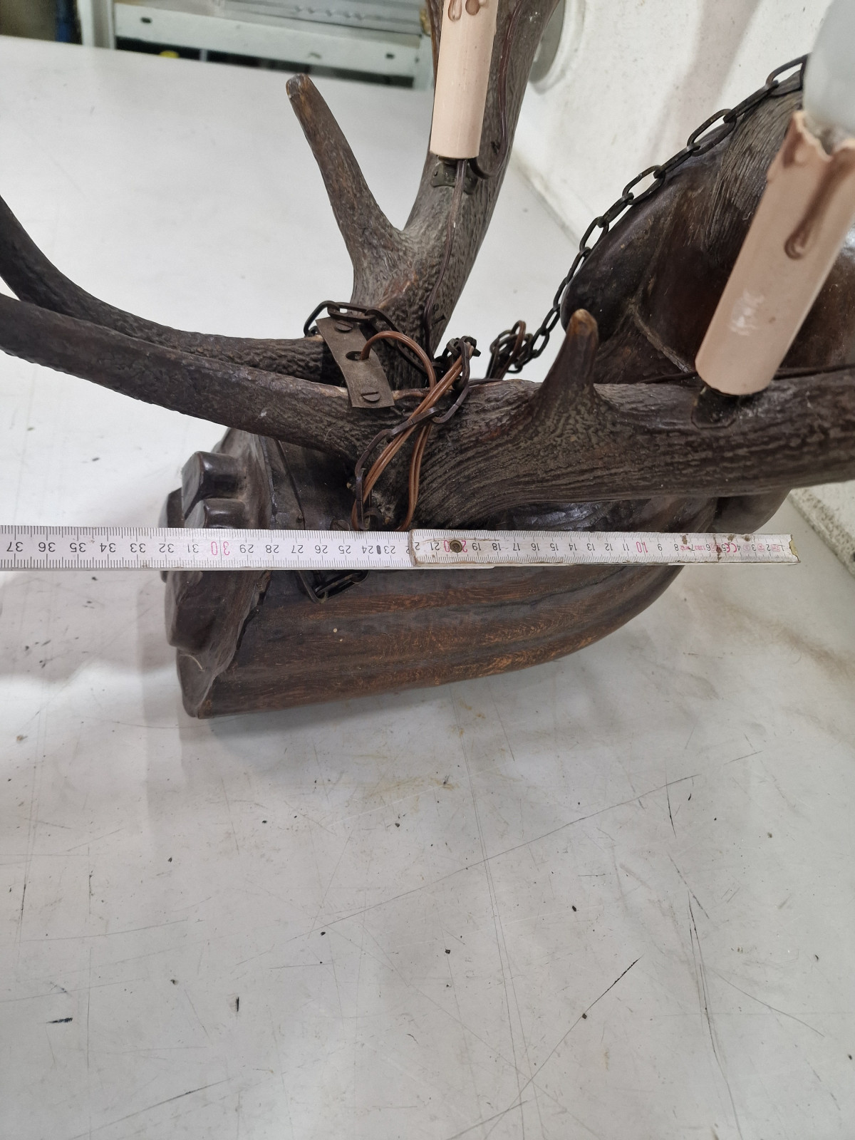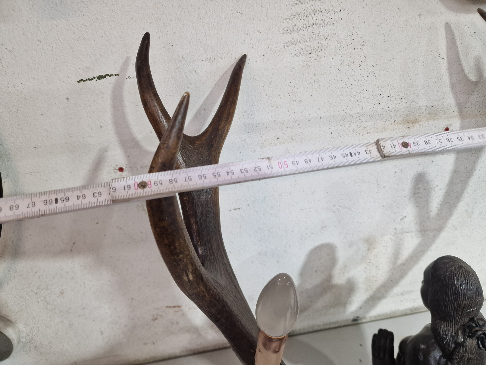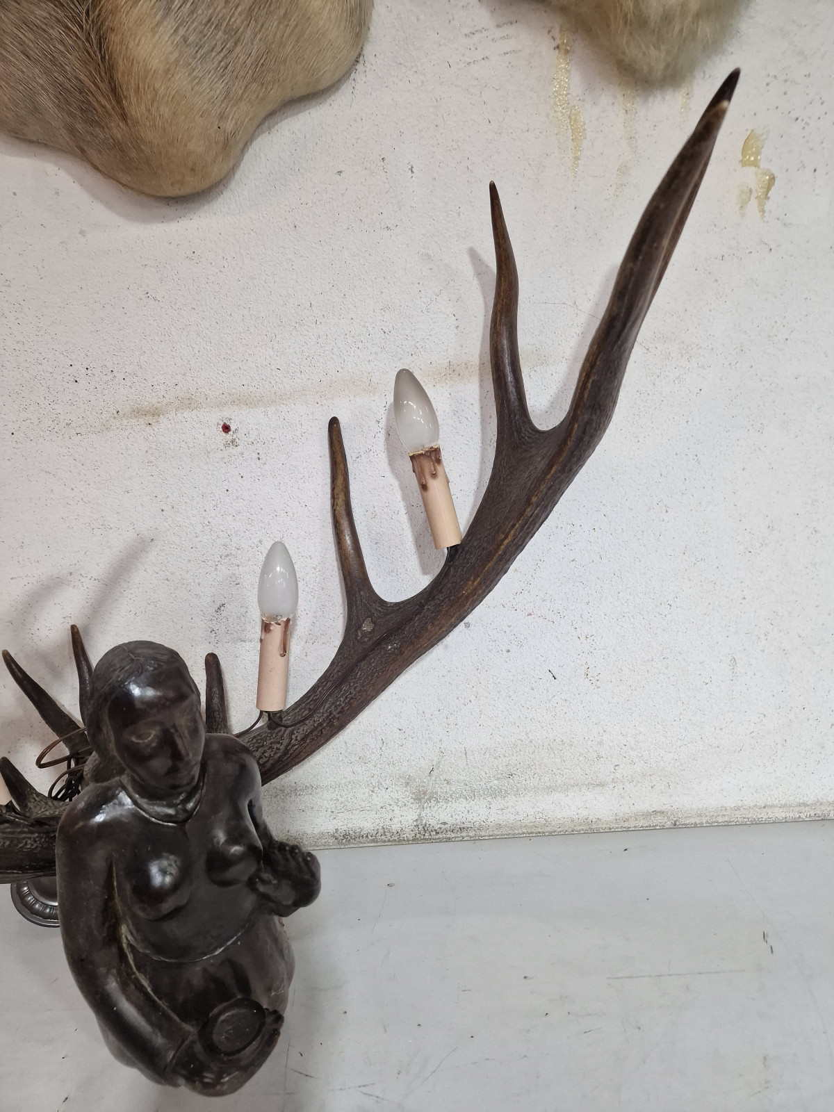 aufwendig von unbekanntem Künstler aus 2 kapitalen Rothirsch Abwurfstangen gefertigt mit detailreicher Holzarbeit in Form einer knieenden Frau in der rechten Hand mit kleiner Ablage zur Aufstellung einer Kerze