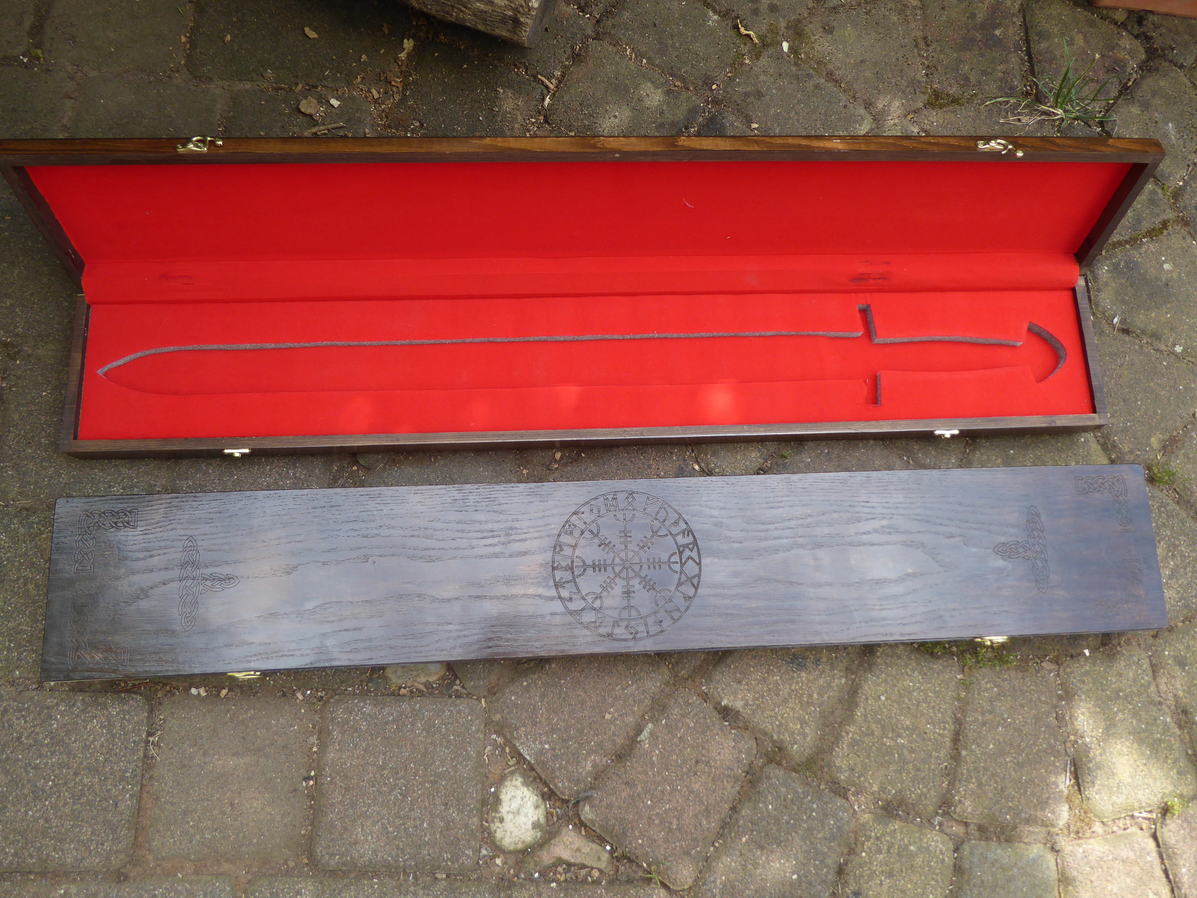 Handgefertigte Sammelkiste für unser Tyrfingir Modell. Die Kiste ist graviert und lackiert. Sie hat ein Inlet zur Aufnahme des Schwert. Das Bild zeigt einmal eine geschlossene Kiste und einmal die geöffnete. Das Angebot umfasst aber nur eine Kiste.