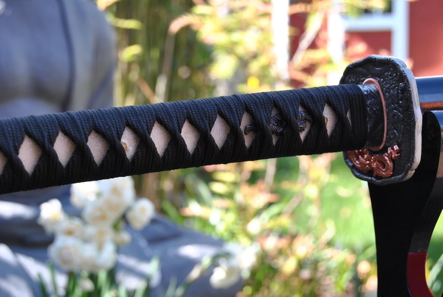 Das Drache Katana Schwert wird von einem Schwertschmied mit langjähriger Erfahrung in Handarbeit kunstvoll gefertigt und nicht wie bei anderen Herstellern mit Hilfe von Maschinen hergestellt. Jedes einzelne Schwert wird von dem Schmied auf traditionelle Weise und mit höchster Sorgfalt angefertigt. Dieses Schwert ist nicht nur ein Kunstwerk das in höchstem Maße dekorativ ist, sondern es ist auch sehr scharf und vollkommen geeignet für echte Kämpfe und Schnittübungen. Es zerteilt mühelos armdicken Bambus oder gleitet nahezu unspürbar durch ein Blatt Papier. Handgeschmiedete Drache Katana Schwert ,von Hand geschmiedeter 1045 Kohlenstoffstahl Gesamtlänge: 103 cm Klingenlänge 72,5cm,Grifflänge 27cm. Gewicht mit Saya : 1270 gr, Gewicht ohne Saya:1050 gr, lackierte Holz Saya Griffumwicklung aus Baumwolle ist traditionell angebracht das Schwert ist scharf geschliffen.Die Klinge besitzt eine BO-HI.Die Klinge ist, zwecks Größerer Sicherheit, mit zwei mekugi (Bambus Zapfen) befestigt. Ohne Ständer.