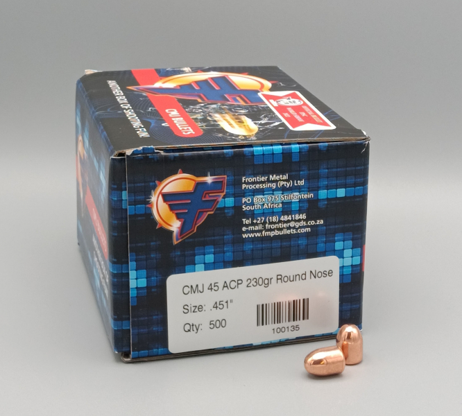 .45 ACP, 45 Auto, 230gr, 230 grain, RN, Round Nose, .451", Frontier, Geschosse, Projektil, CMJ, Vollmantel, Bleigeschoss, Wiederladen, Wiederladezubehör, Schießsport, IPSC, BDS, Training, Wettkampf, Pistole, Indoor, Kupfermantel, Munition selbstladen