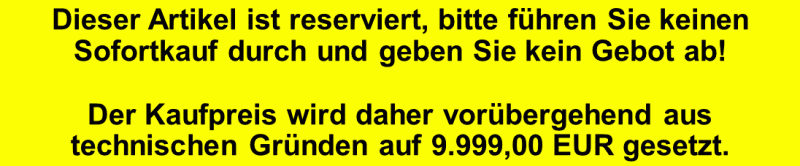 Dieser Artikel ist reserviert, bitte führen Sie keinen Sofortkauf durch und geben Sie kein Gebot ab! Der Kaufpreis wird daher vorübergehend aus technischen Gründen auf 9.999,00 EUR gesetzt. (Der ursprüngliche Angebotspreis war 2799,00 EUR)