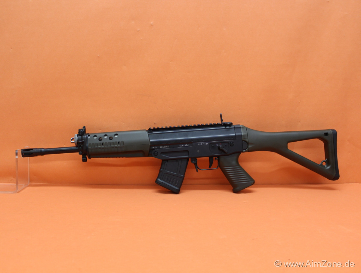 System SIG SG550, 305mm Lauf (Drall 1-9,5"), Mündungsfeuerdämpfer, klappbares Korn und Lochkimmenblatt, 4-Positionen Gas-Piston-System, Picatinnyschiene auf Gehäuseoberseite, beidseitige 45° Sicherung, olivgrüner Polymer-Handschutz/ -Pistolengriff mit Staufach/ -Schaft (Klappmechanismus fixiert), 10-Schuss Magazin. Incl. Reinigungsset. Kunststoffkoffer als Transportverpackung.