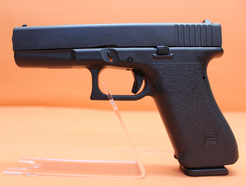 Ha.Pistole 9mmLuger Glock P80: Classic Edition (Historischer Nachbau der Glock 17 Gen1) Lauf 114mm, feststehende Polymer-Kontrastvisierung, Polymer-Griffstück (OHNE Zubehörschiene), Safe Action Abzug ca. 25N (teilvorgespannt, 2,5kg Steuerfeder), 17-Schuss Magazin. Incl. Reservemagazin/ Ladehilfe/ Putzstock/ Putzbürste. Kunststoffdose als Transportverpackung. Lieferung mit Zertifikat im Präsentations-Umkarton.