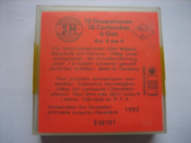 Aus Sammlungsauflösung wird angeboten -- Eine Schachtel mit 10 Stk. Gaspatronen - mit Kunststoff Faltverschluß - für Selbstladepistolen aller Modelle - besonders starke Ladung - Hersteller SM - 8 mm für Pistole - Ladung: 100 mg. Chloracetop... - Patronen wurden kühl und trocken gelagert - Haltbar bis 12/1992 -- Patronen können Oxidationsspuren aufweisen +++ Der Versand erfolgt mit DHL (unversichert). Die Versandkosten gelten nur für Deutschland. -- Kein Internationaler Versand -- Privatverkauf, daher keine Gewährleistung, Garantie oder Rücknahme. Bei Fragen einfach mailen.