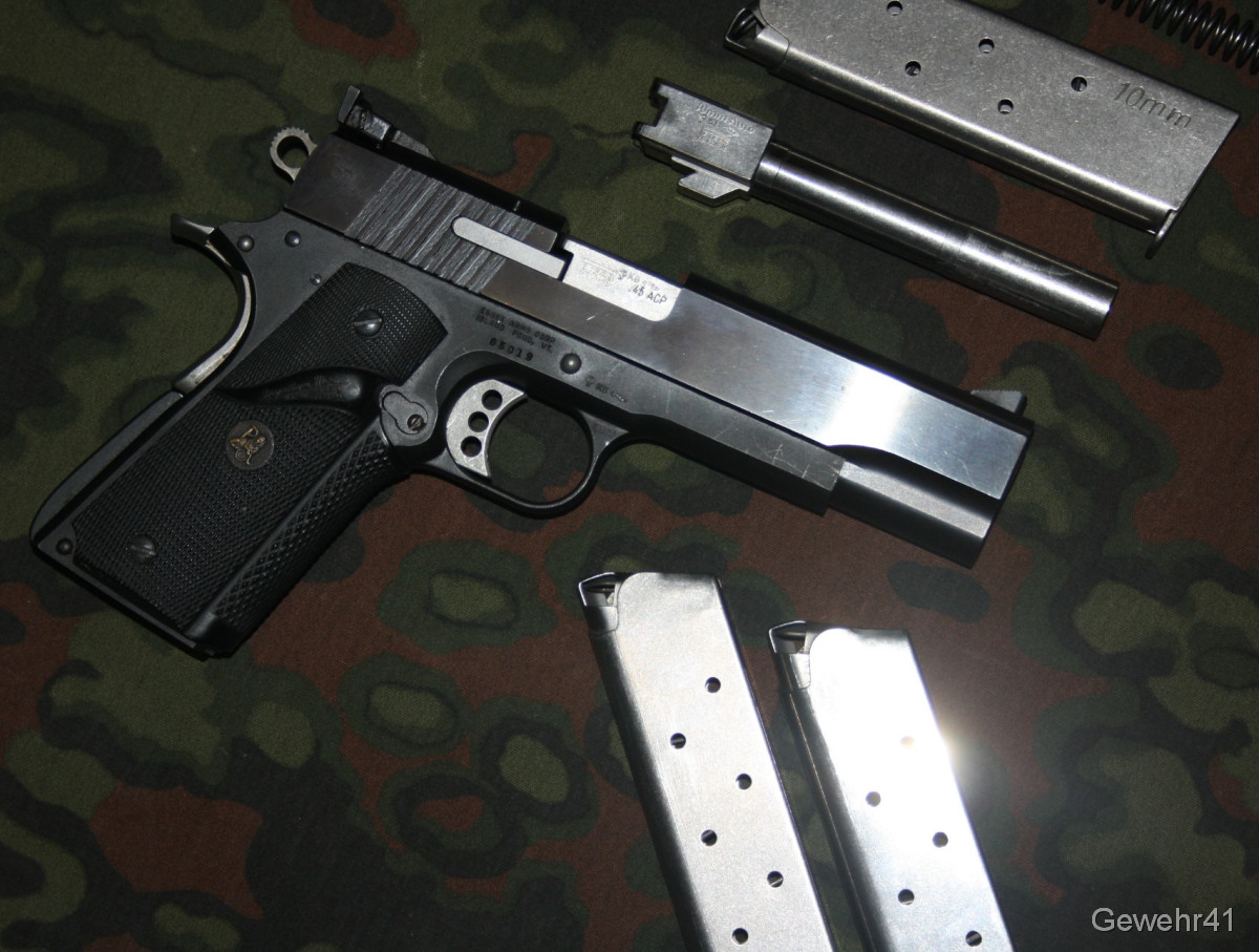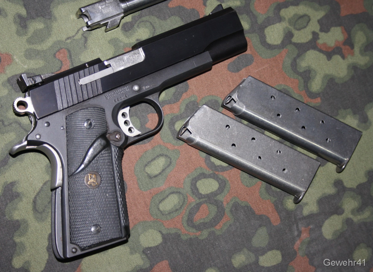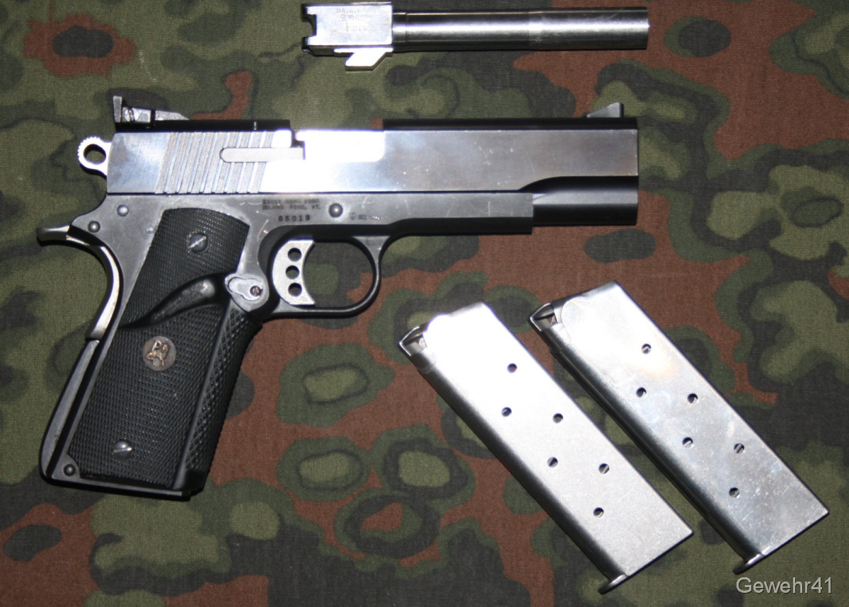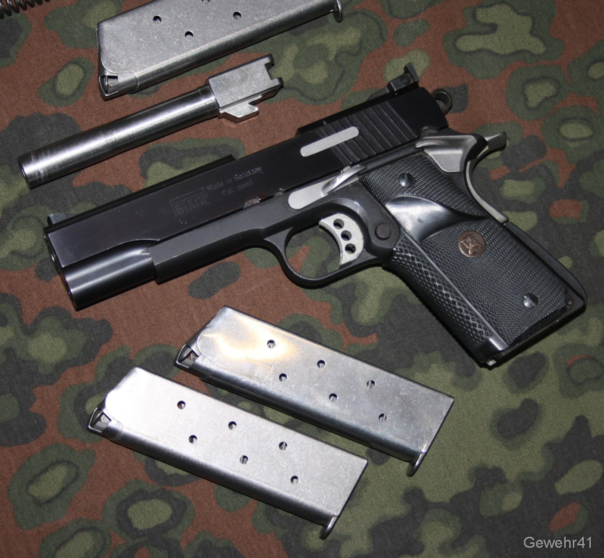 Sie bieten auf eine 1911er Sportpistole von Peters Stahl Modell "Multicaliber" im Kal. .45ACP mit Wechsellauf im Kal. 10mm Auton. Alles im schönen Zustand mit nur leichten Gebrauchsspuren. Die Waffe stammt aus Erstbesitz und wird aus Altersgründen verkauft. Lauf und Funktion einwandfrei.