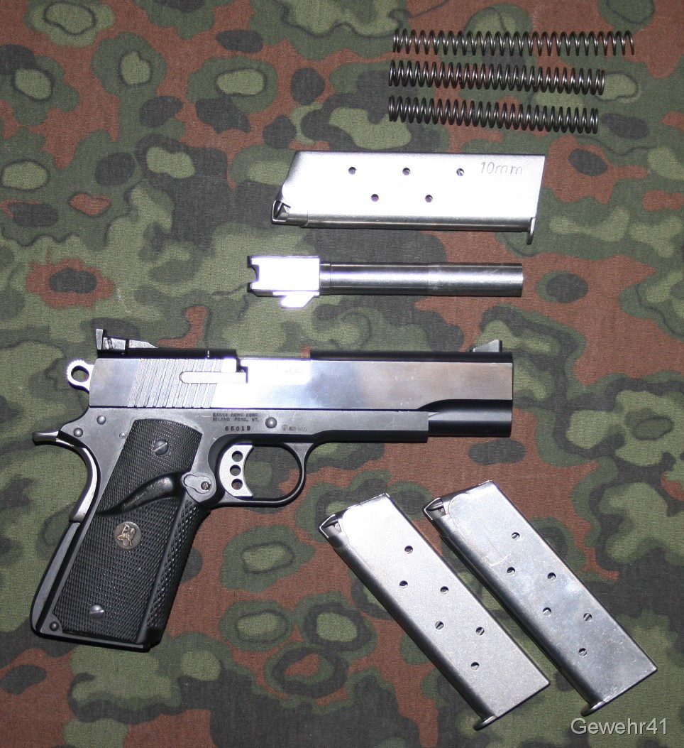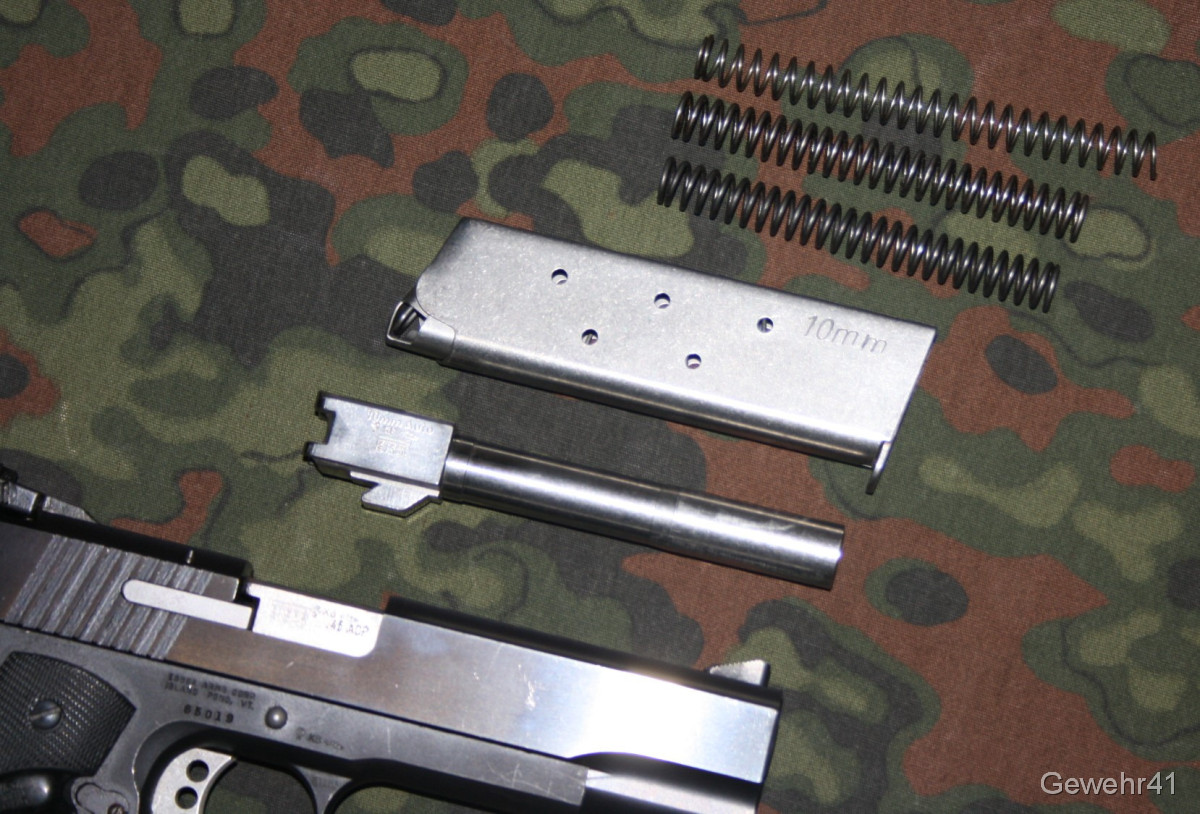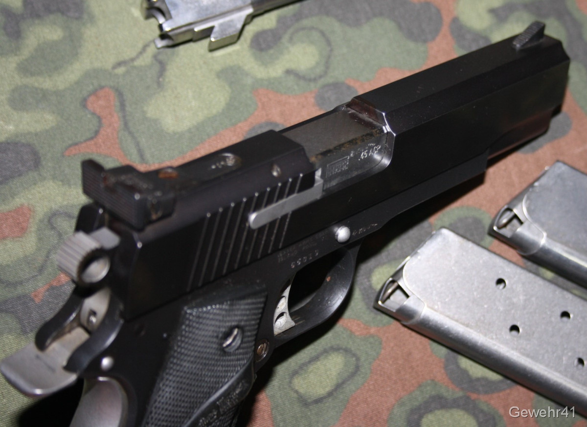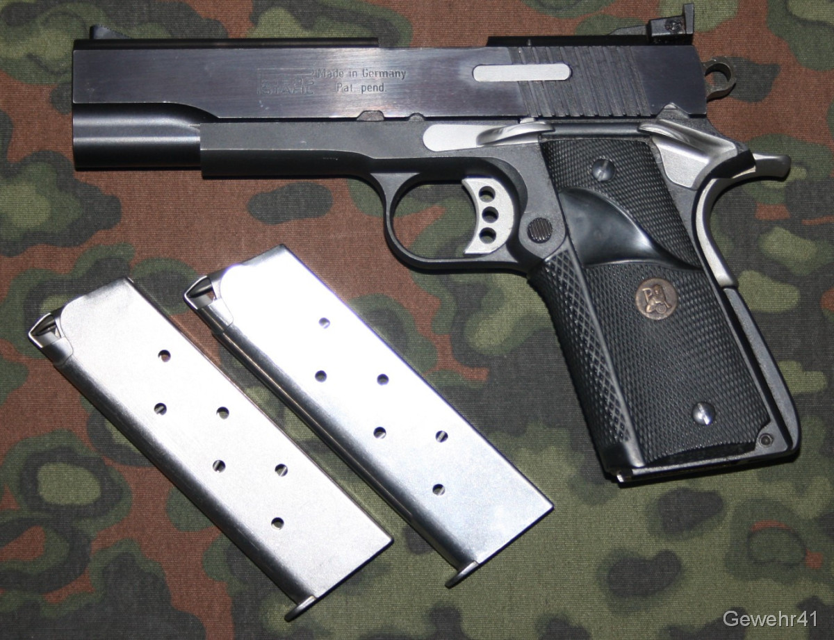 Sie bieten auf eine 1911er Sportpistole von Peters Stahl Modell "Multicaliber" im Kal. .45ACP mit Wechsellauf im Kal. 10mm Auton. Alles im schönen Zustand mit nur leichten Gebrauchsspuren. Die Waffe stammt aus Erstbesitz und wird aus Altersgründen verkauft. Lauf und Funktion einwandfrei.