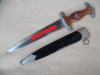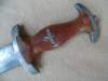 Originaler früher Dienstdolch des NSKK mit ausgeschliffener Röhmwidmung von E. Pack & Söhne, alle Beschläge Neusilber, braun brünierte Scheide lt. behördlicher Anordnung im Juni 1936 schwarz überstrichen, Griff durch zu strenges Anziehen der Kofschraube mit Sprüngen siehe Bilder.