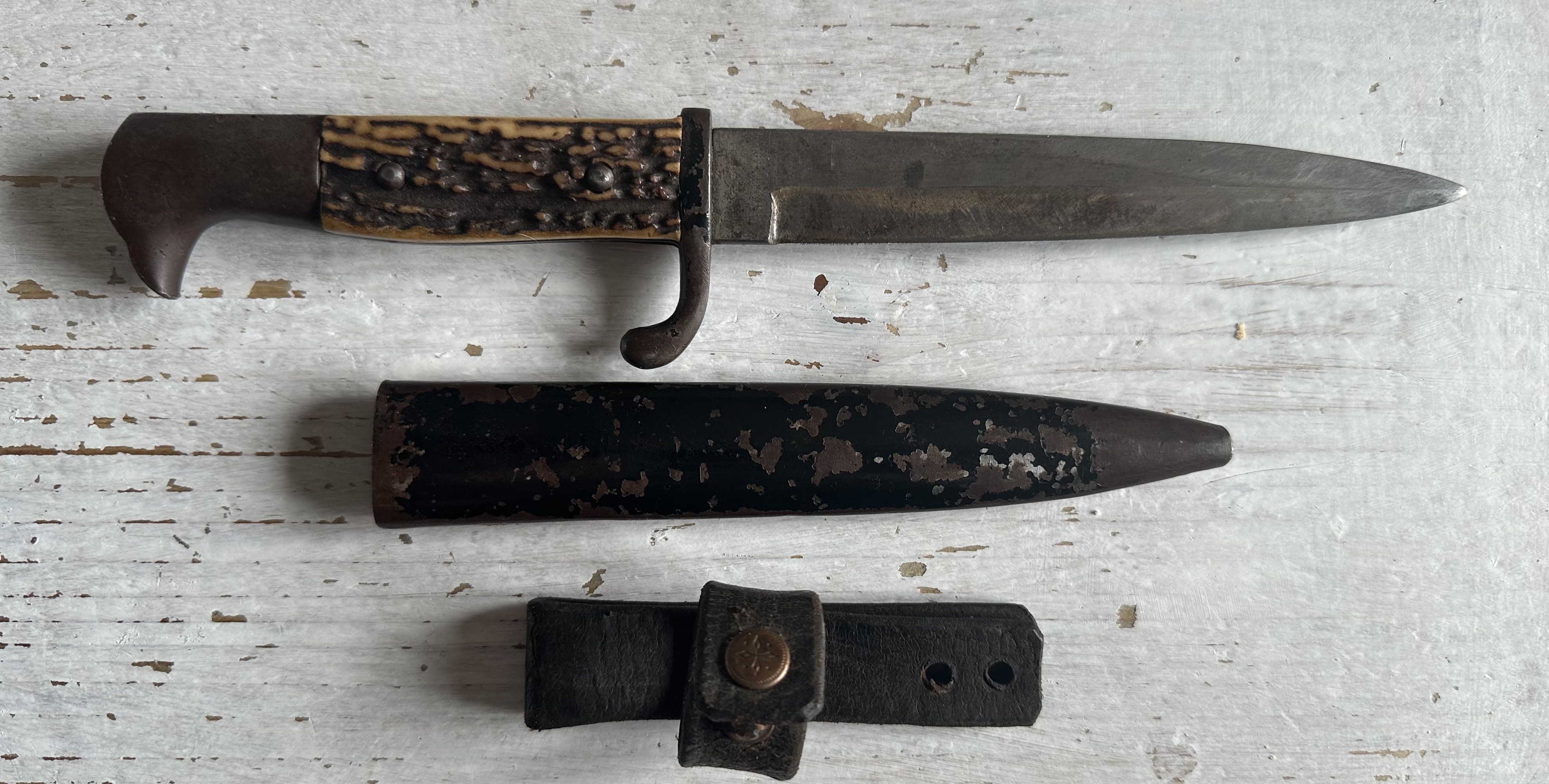 Deutscher Grabendolch für Offiziere WK I, Griff aus Hirschhorn, original Lack, original Beriemung zur Vernietung anbei. Sehr schöner originaler Zustand. Privatauktion, keine Rücknahme, kein Umtausch, keine Gewährleistung, keine Garantie. Viel Spass beim Bieten