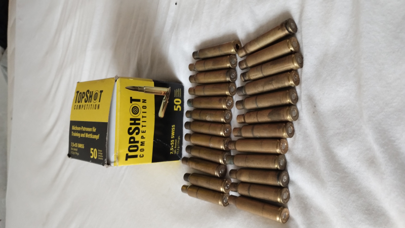 Angeboten werden hier 24 Hülsen von Norma und 60 Hülsen von Top Shot im Kaliber 7,5x55 swiss.