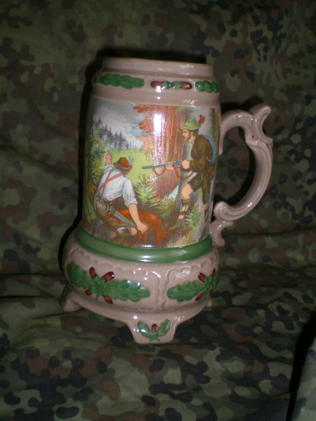 Großer alter prächtiger Bierkrug mit Jagdmotiv im Stil um 1900