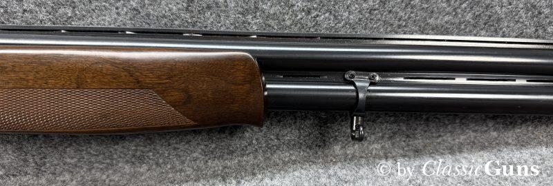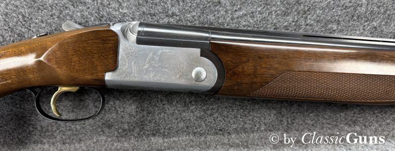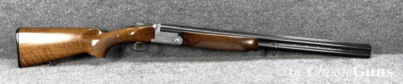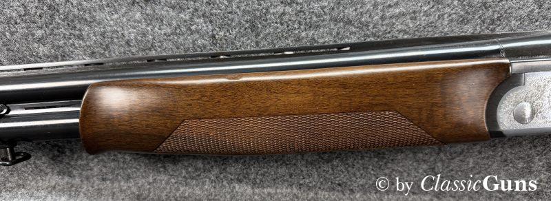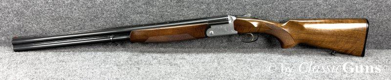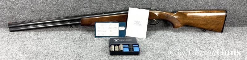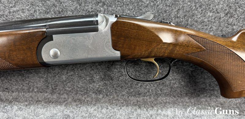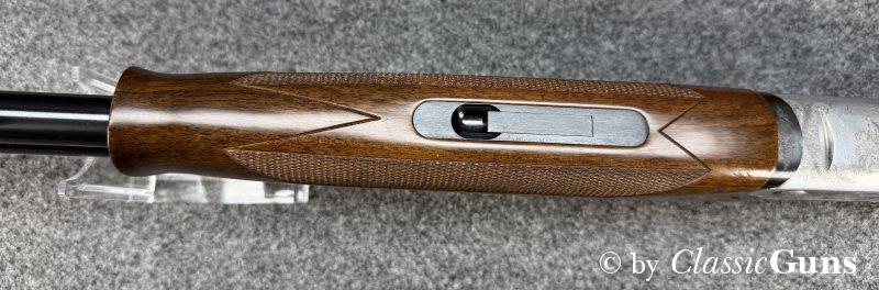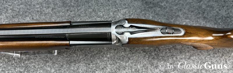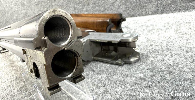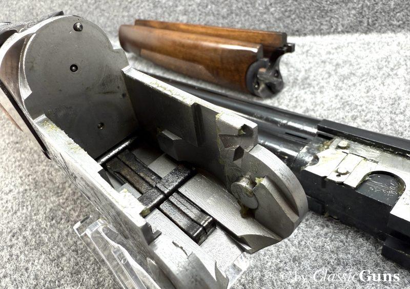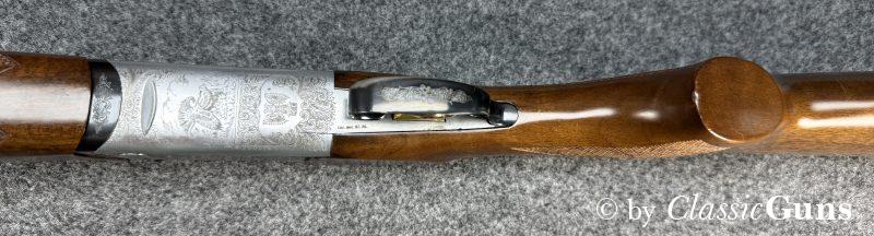 Das Laufbündel ist 710 mm lang, die Laufseelen sind spiegelblank und mit Wechselchokes ausgestattet. Sehr gut erhaltene Brünierung der Stahlteile, schlicht gemaserter Nussbaumschaft mit minimalen Gebrauchsspuren. Umschaltbarer Einabzug, manuelle Sicherung und Umschaltung auf dem Kolbenhals, kräftige Ejektoren, absolut dichter Verschluss, dezent gravierte Basküle.