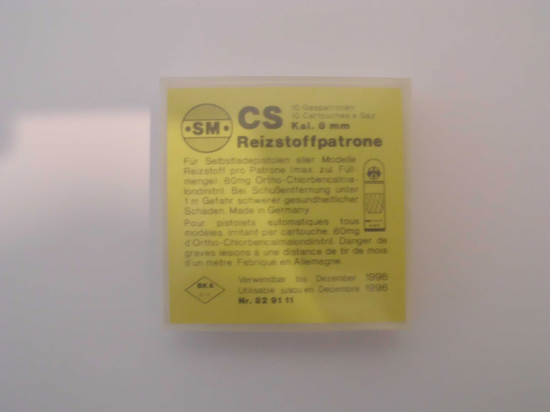 Zum Verkauf steht je 1 Packung SM-Reizsoffpatronen im Kaliber 8mm (8x20). Fabrikat SM. Diese hochwertige und wirkungsvolle Munition wird leider schon seit Jahrzehnten nicht mehr produziert. Bitte beachten Sie auch meine anderen Auktionen. Bei Bestellung mehrerer Artikel fällt selbstverständlich nur einmal Porto an.