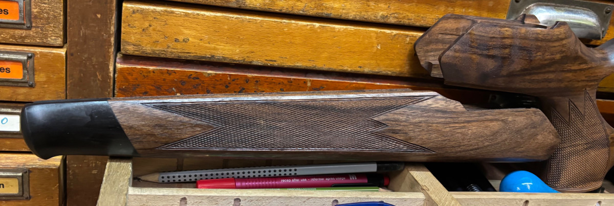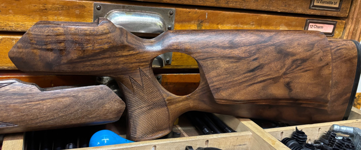 Die Länge ist Standard, die iberfläche wurde mit einem Ölfinish versehen, die Fischhaut ist handgeschnitten, am Pistolengriff