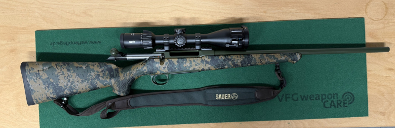 Mit zum Angebot gehört ein Meopta Meohunter R5 3-15x50 mit beleuchtetem Absehen 4C, welches - wie auch die zum Angebot gehörende Montage - erst im Sommer diesen Jahres gekauft wurde und absolut neuwertig ist. Weiterhin umfasst das Angebot eine vom Büchsenmacher montierte Picatinnyschiene, den original Sauer Ergo-Rest Riemen, die vor kurzem erst gekauften Alan Riemelbügel und einen ebenfalls im Sommer erworbenen Rusan MAR 56-Adapter, der vom Büchsenmacher schön stramm gesetzt wurde.