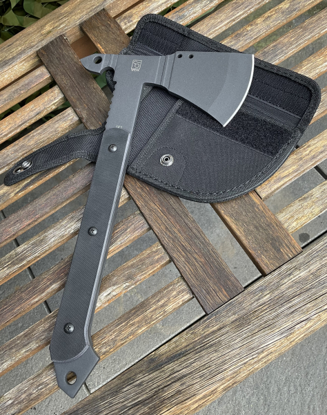 Das Vox T Hawk von Böker ist sprichwörtlich der Hammer. Die super robuste Konstruktion besteht aus einem Stück SK 5 Kohlenstoffstahl. Das ganze ist zum Schutz mit einer widerstandsfähigen Pulverbeschichtung versehen. Die Schneide ist höllisch scharf und ist vielseitig einsetzbar. Die G10 Beschalung ist dreifach verschraubt und ist sehr griffig. Alternativ entfernbar für eine Paracordwicklung. Mit einer vernünftigen Gesamtlänge von rund 36 cm hat man eine adäquate Reichweite ! ( Nicht noch so ein 25 cm Spielzeug ). Die dazugehörige Nylonscheide passt schmatzend ( da wackelt nichts ! ). Gewicht ca 790 g, Klingenstärke ca 6,2 mm. Das Hawk ist unbenutzt und absolut neuwertig. Nicht mehr lieferbar !!! Keine weitere Garantie oder Rücknahme. Lieferung nur innerhalb Deutschland.