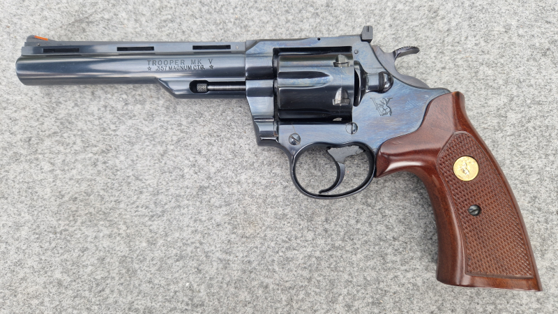 Colt Trooper Mark V im Kaliber .357 Magnum. Bestzustand. Brüniert, 6 Zoll Lauflänge , Ventillierte Laufschiene, Original Holzgriffschalen mit Colt Medallion. Deutscher Beschuss.............Für Jäger, Sportschützen, Sammler,....... .................Verkauf von Privat unter Ausschluss jeglicher Sachmängelhaftung und Gewährleistung. Keine Rücknahme des Artikels. Zahlung und Abnahme nach Auktionsende. Kein Versand ins Ausland. ......... Foreign bidders: I don't offer export. If you buy, you have to organize export through a german gun dealer of your choice