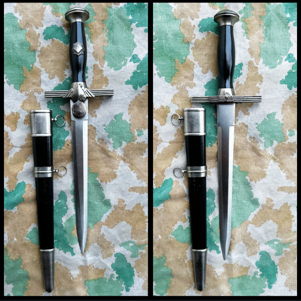 Dolch mit 28 cm Stahlklinge, gerader Parierstange und passender Scheide mit 2 Ösen zur Befestigung an der Uniform. Reproduktion des Dienst- bzw. Führerdolch des Reichsluftschutzbund des 3. Reichs.