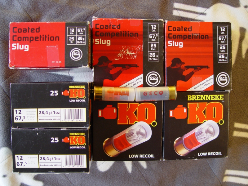 100 Patronen Brenneke K.O. Low Recoil mit 28,4 Gramm (1 oz) Geschossgewicht in 4x Originalverpackung und 50 Schuss Geco Coated Competition Slug mit 26 Gramm (15/16 oz) Geschossgewicht in 2x Originalverpackung.
