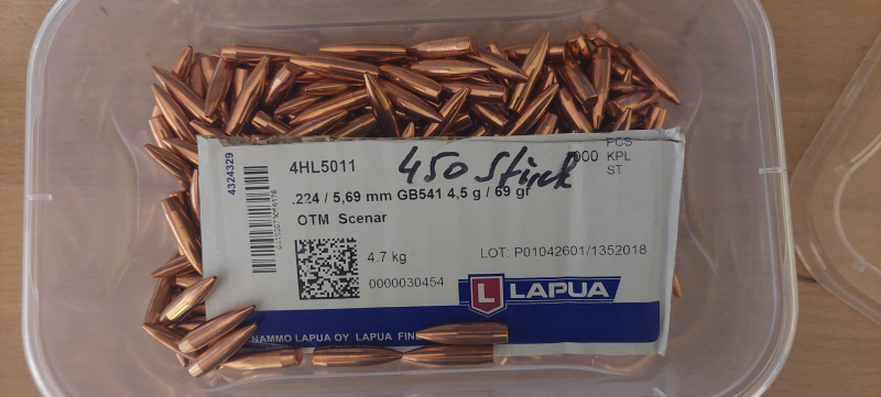 Bitte hier 450 Stück Lapua OTM Scenar 69 gr,100 Stück Hornady Match BTHP 52gr und 160 Stück Hornady Match BTHP