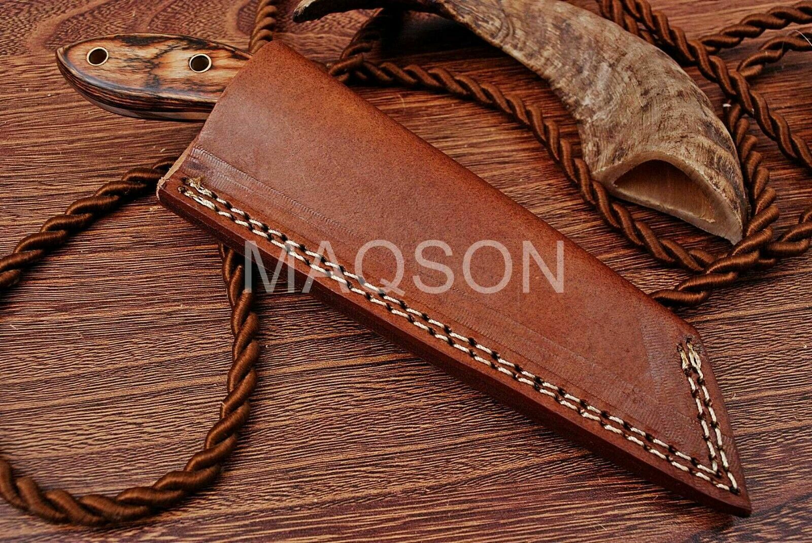 Die ebenfalls handgefertigte Lederscheide besteht aus hochwertigem Rindleder und wurde dem Messer genau angepasst.