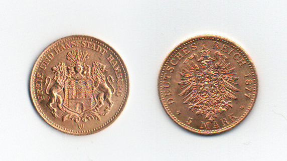 Goldmünze, 5 Reichsmark Hamburg von 1877.