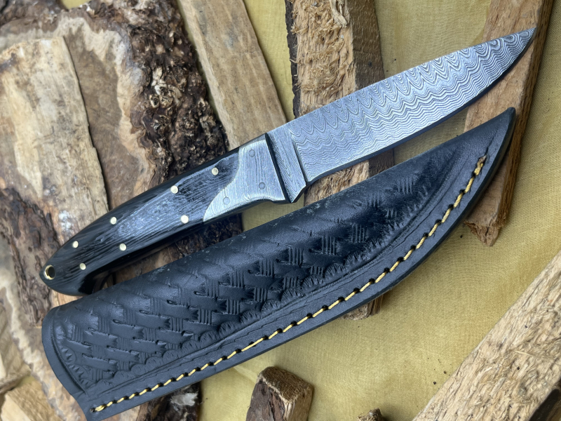 Typ: Handgefertigtes Damast-Jagdmesser aus über 200 Lagen. Wangi-Holzgriff mit Damast-Bolstern. Inklusive Lederscheide.