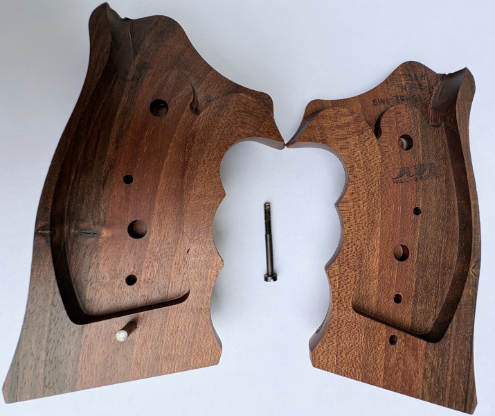 Zum Verkauf steht ein originaler Holzgriffsatz von Nill-Griffe für Smith & Wesson Revolver.