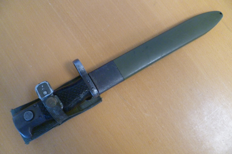 Zugehörige Bajonettscheide ebenso teils stärkere Gebrauchsspuren.