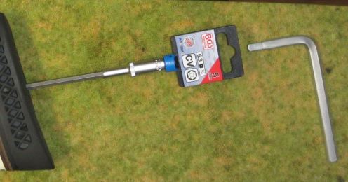 Das Werkzeug hat einen 300 mm langen Sechskant-Stahlstab SW 5mm mit einer lose aufgesetzten neuen langen Steckschlüssel-Innensechskantnuss SW 5mm von BGS (für einen 1/4 Zoll Ratschenantrieb) und einen Edelstahl-Vierkant-Winkelschlüssel SW 6mm mit transparenter Silikonhülle zum Schutz des Laufes bei der Vorderschaftmontage.