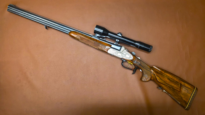 Die Leichtmetall-Basküle ist mit einem Horn-Abzugsbügel, goldfarbenen Abzügen und goldfarbenem Auszieher ausgestattet. Der Schaft ist sehr schön gemasert, in typisch Ferlacher Form neu geschäftet und mit fein geschnittener Fischhaut sowie Eichenlaub-Verschnitzungen verziert. Das Schaftmagazin fasst 2 große und 3 kleine Kugelpatronen. Mittels Suhler Einhakmontage ist ein Zeiss Diavari Z 1,5–6×42 (Absehen 4) montiert — praxisgerechte Kombination für Pirsch und Ansitz. Die Basküle ist mit langen Seitenplatten ausgestattet und mit Tierstückmotiven sowie Eichenlaub graviert.