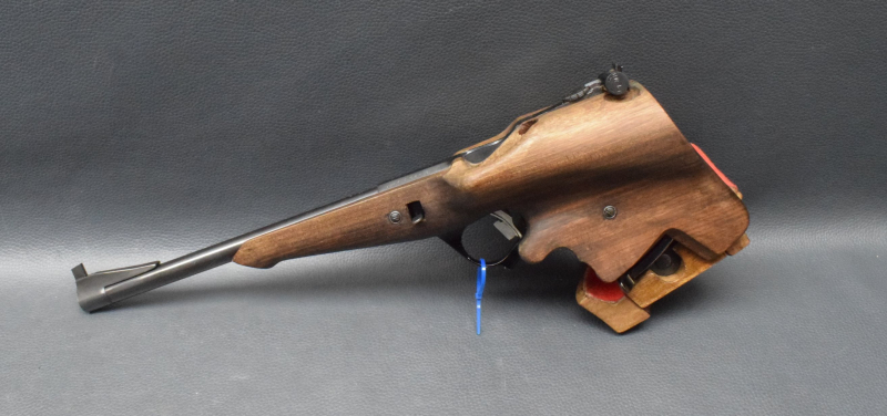 unten am Griff liegender Spannhebel, innenliegendem Hahn, einstellbarer Formgriff für Rechtshänder Gr. M. Lauf sehr gut, Brünierung 97% Gebrauchtwaffe, gut
