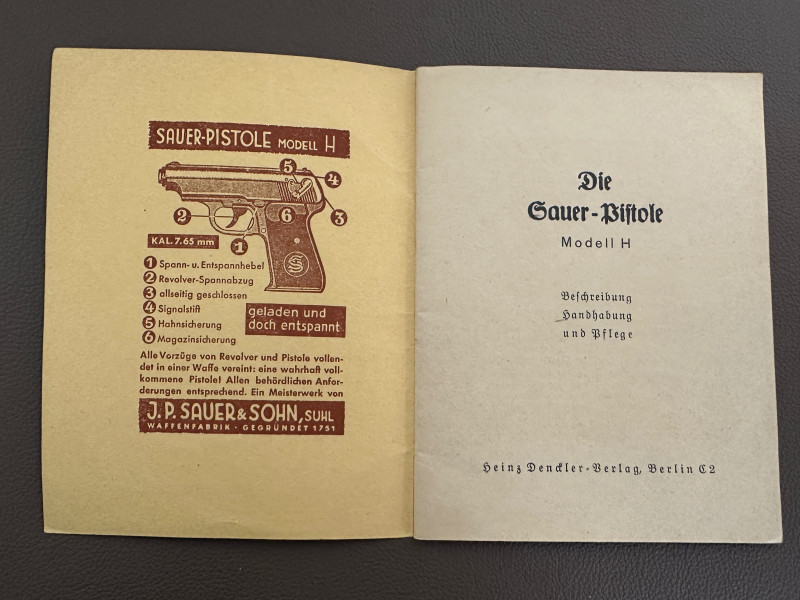 ORIGINAL Prospekt"Die Sauer-Pistole Mod.H" Verlag Heinz Denker Verlag, Berlin 16 Abb. 24 S.