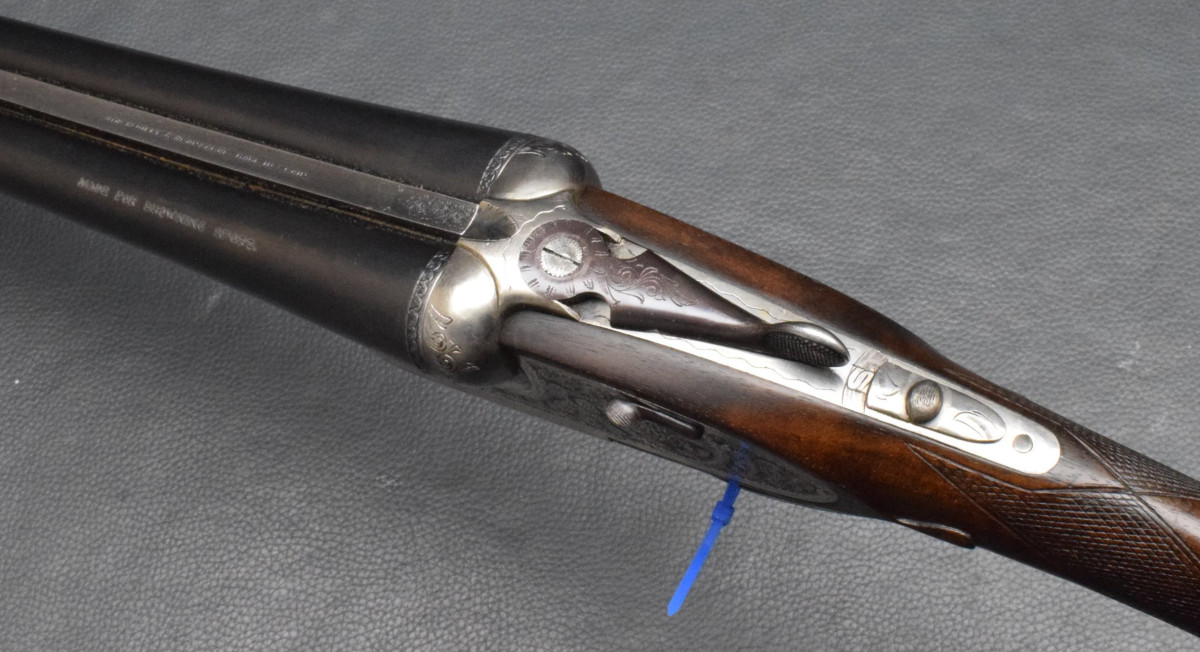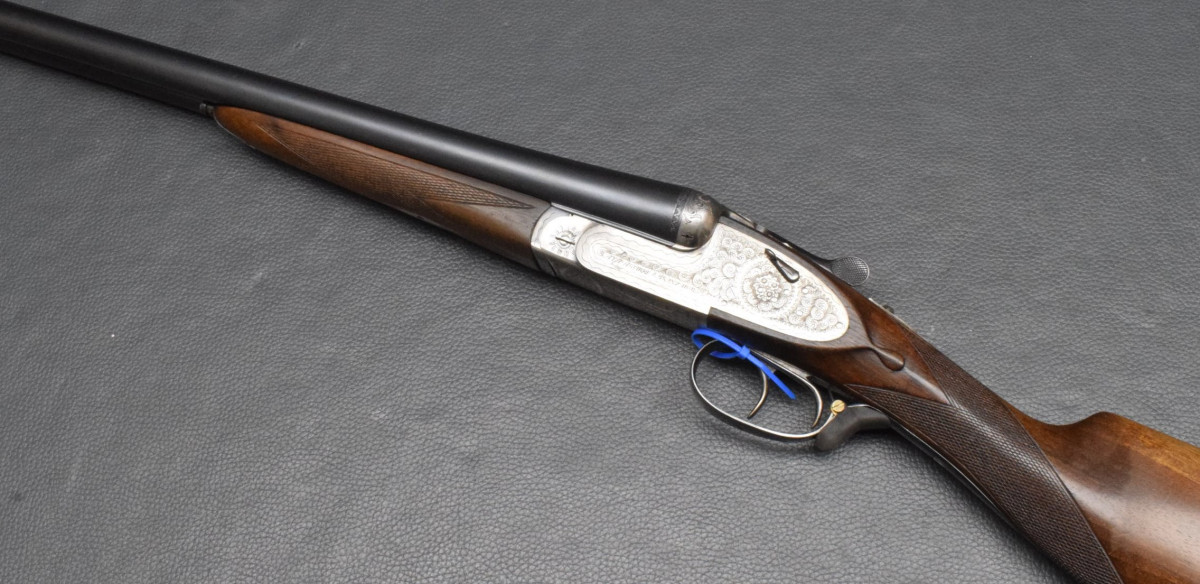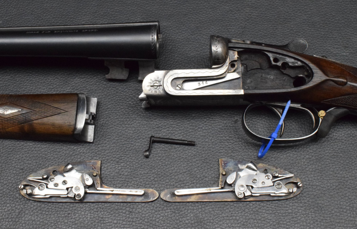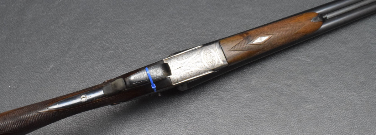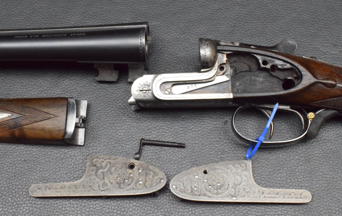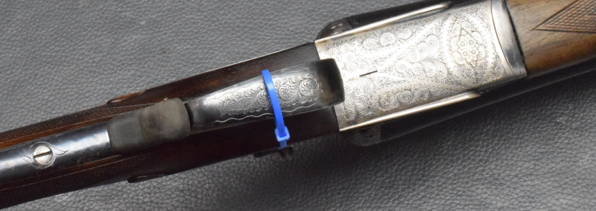 Silberkorn, Stahlbasküle mit Arabeskengravur, Seitenschlosse, Lauf mit Ejektoren, Sicherungschieber auf dem Kolbenhals,