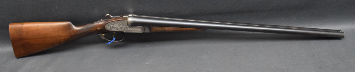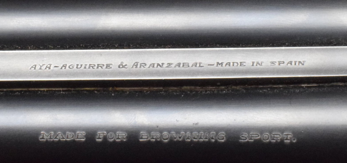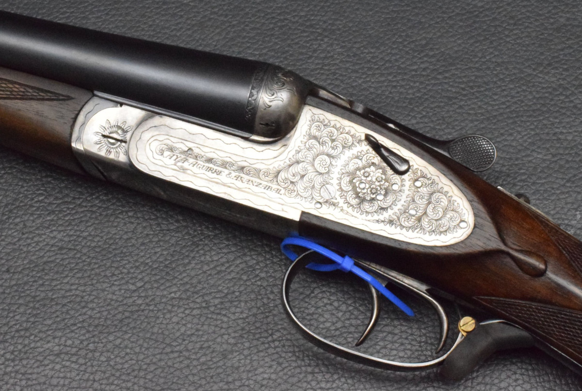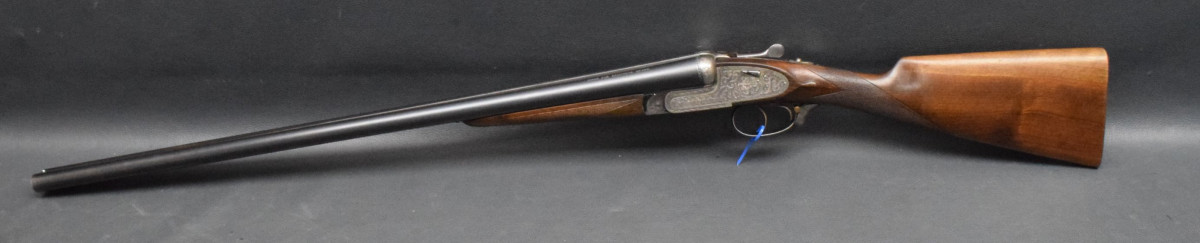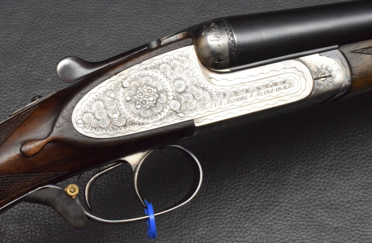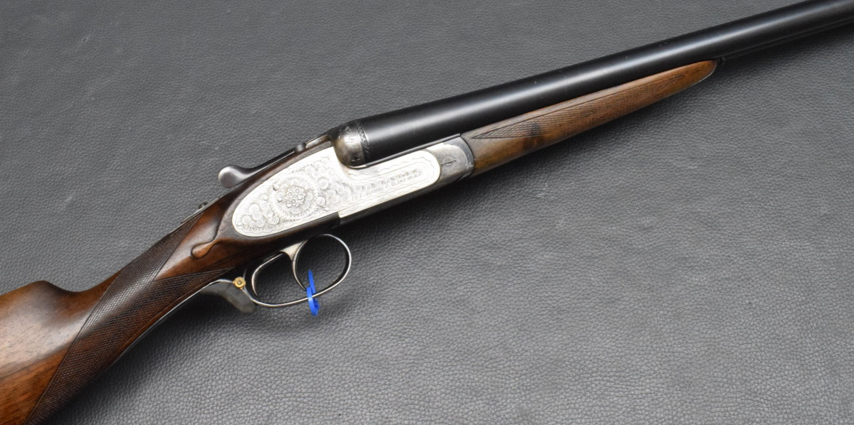 Silberkorn, Stahlbasküle mit Arabeskengravur, Seitenschlosse, Lauf mit Ejektoren, Sicherungschieber auf dem Kolbenhals,