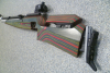 Schichtholz-Schaft mit teilweise deutlichen Gebrauchsspuren und einem feinen Riß linksseitig am Pistolengriff.