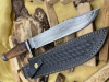 Typ: Handgefertigtes Damast-Bowie-Messer aus über 200 Lagen. Vollerl-Klinge aus Damaststahl. Walnussholzgriff mit Damast-Parierstange und -Knauf. Inklusive Lederscheide.