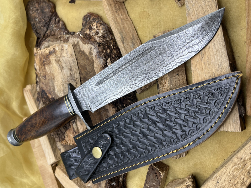 Typ: Handgefertigtes Damast-Bowie-Messer aus über 200 Lagen. Vollerl-Klinge aus Damaststahl. Walnussholzgriff mit Damast-Parierstange und -Knauf. Inklusive Lederscheide.