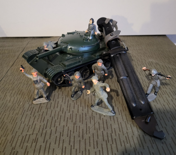 Zum Verkauf kommt dieses NVA Bajonett M59/2 und das Spielzeugzubehör . Das Bajonett ist in neuwertigen Zustand 1 . Es hat die DDR NVA typischen Abnahmestempel und ist nummerngleich NVA mäßig gekennzeichnet . Das DDR NVA Spielzeug ist anbei . Soldaten und Panzer sind auch DDR Produktion . Eine Gummigleiskette fehlt , auch sonst ist der Panzer nur noch zur Deko oder Ersatzteilspender für Bastler nutzbar . Verkauf ab 18 m. Nachweis . Porto EU bitte anfragen .