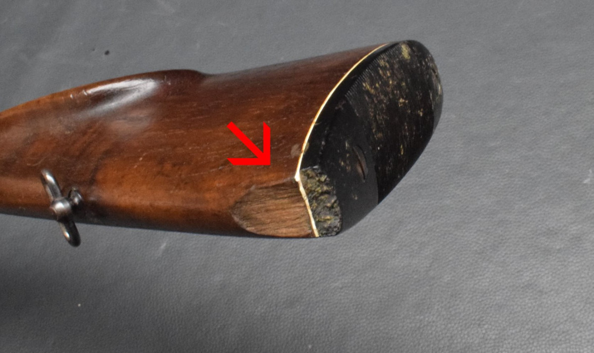 Lauf sehr gut, Brünierung 96%, Schaft mit 2,5cm Ausbruch (Foto),