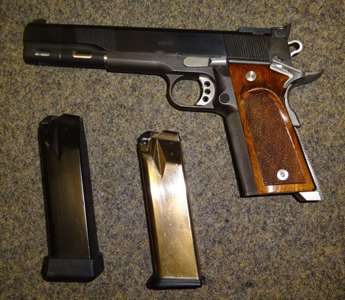 Hier wurde an nichts gespart, und das merkt man schon vor dem ersten Schuss: Sportpistole auf Basis der COLT 1911 Government, mit Para-Ordnance Griffstück, auf 15cm (6Zoll) verlängerter Lauf (von Nowlin). Lauf und Schlitten vom bekannten Waffentuner Krappmann mit spezieller konusförmiger Laufpassung aufwendig verfeinert. Der glockenförmige vordere Laufabschluss geht bündig in die Verlängerung des Schlittens über und verriegelt absolut präzise und wackelfrei. (Dieses System hatte zunächst der Konstrukteur Walter Ludwig marktreif gemacht). Hier also noch einmal kombiniert mit längerer Visierlinie, verlängerter durchgehender Federführungsstange und absolut spielfreiemLauf des Schlittens auf dem Griffstück. Mehr Präzision geht nicht. Weitere Features: Matchabzug, getunt auf 1100g Abzugsgewicht bei vorbildlicher Abzugscharakteristik, punzierte Nill-Griffe, Griffstück vorn und hinten gecheckert für sicheren Halt. Lauflänge: 15cm. Mikrometervisier, Matchhammer.