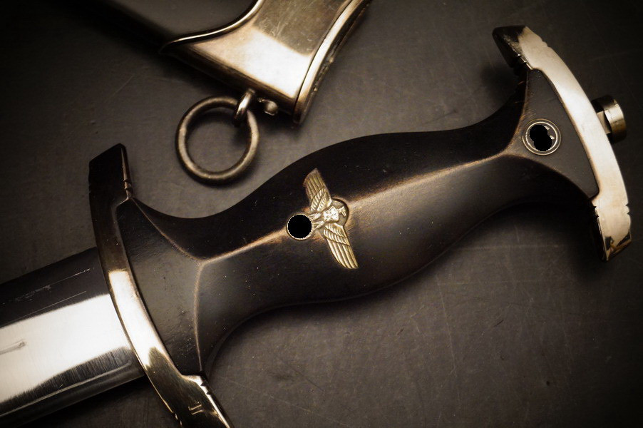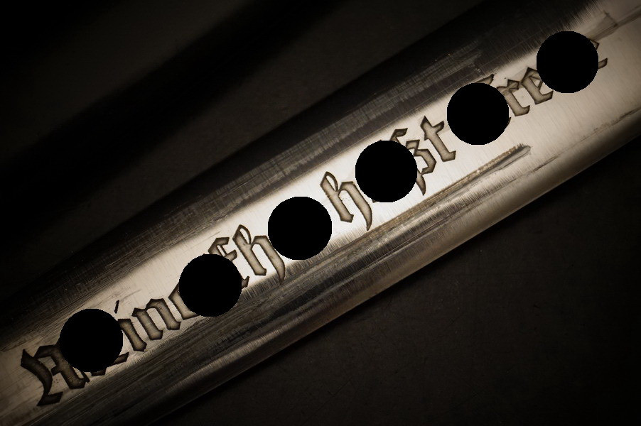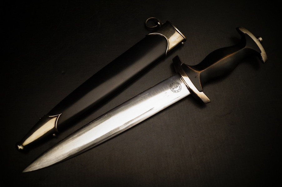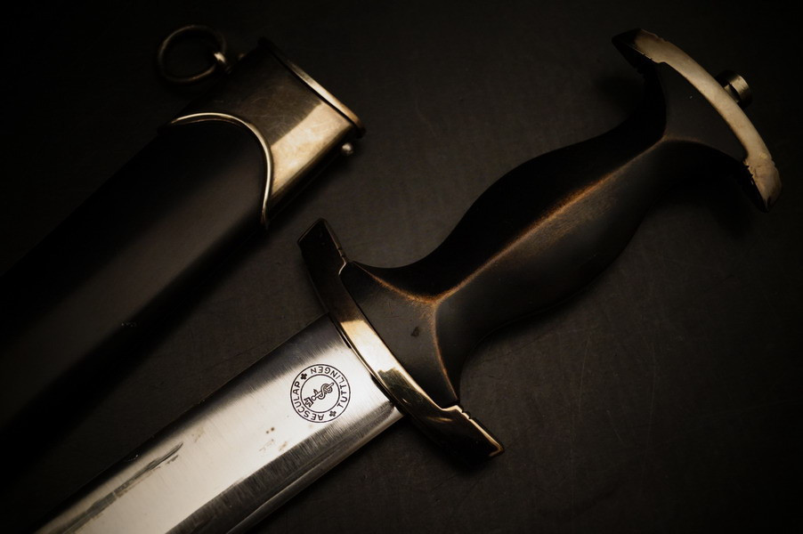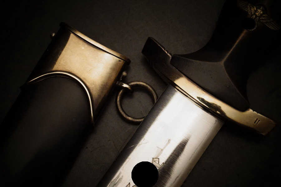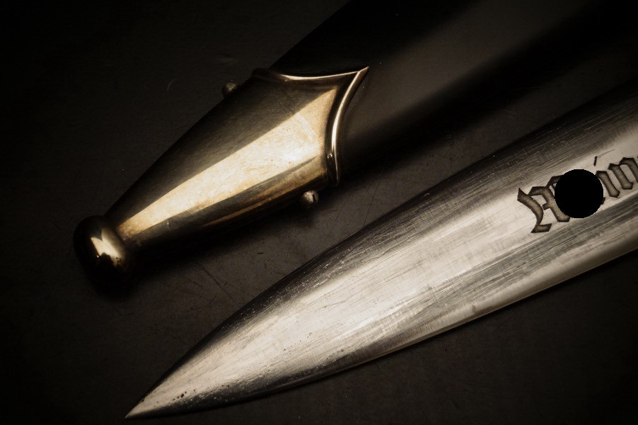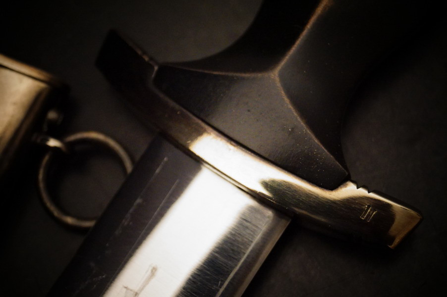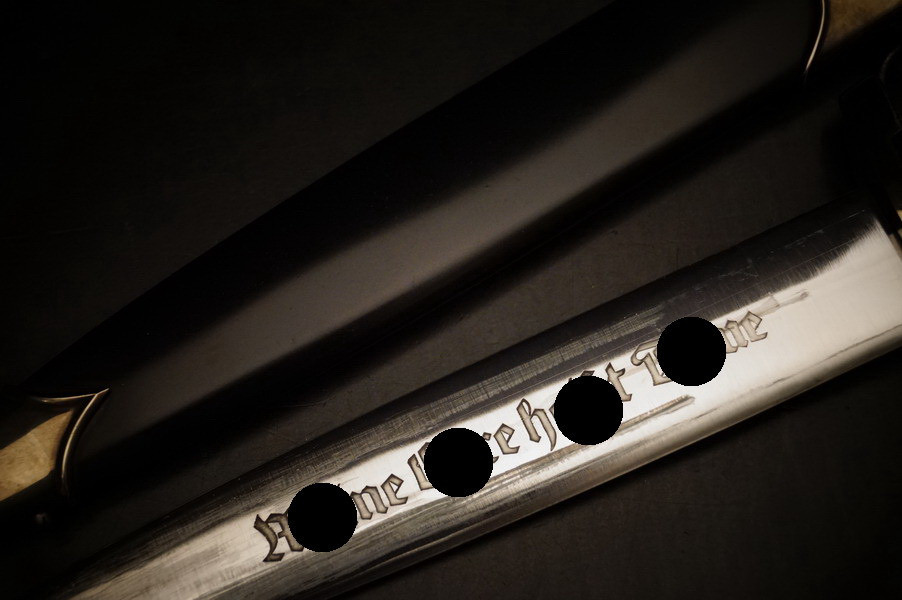 Fundzustand. Neusilberteile wie Beschlagteile und Parierstangen. Stahlscheide mit innenliegenden Zungenfedern. Saugender und sehr guter Sitz der geschmiedeten Klinge. Klinge mit Motto und Herstellerätzung. Holzgriffstück mit Neusilberadler. Klinge ohne Kratzer.
