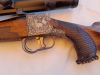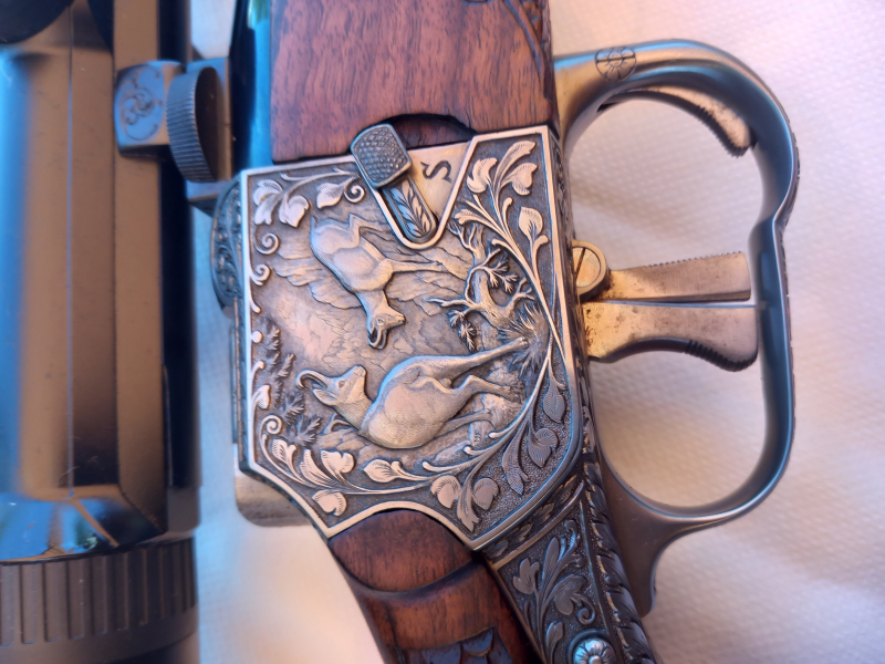 Hochwertige Heerenbüchse , Ferlach , Outschar, Stutzen mit Schaftverschneidung und Schuppenfischhaut, Hornabschluss, aufwendige Relievgravur. Kaliber 6,5x57R mit super Schussleistung, Zielfernrohr Zeiss Diavari M 2,5-10x50 T* , Absehen 4 mit Leuchtpunkt, Suhler Einhakmontage.