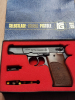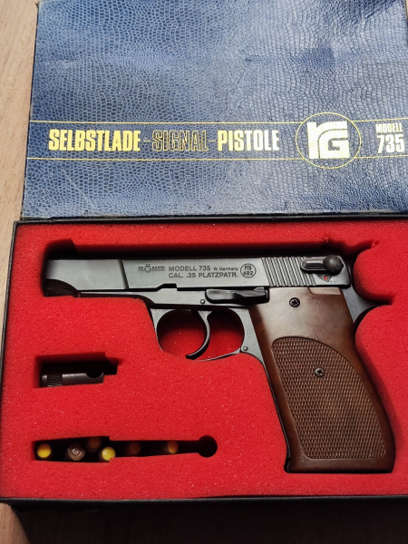 Pistole wurde genutzt, Abgabe in OVP und mit Abschußbecher. Abgebildete Gasplatzpatronen sind NICHT Bestandteil der Auktion, können aber bei Abholung mit ausgehändigt werden.