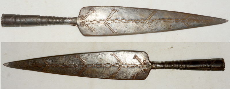 Original afrikanische Speerspitze, 1. Hälfte des 20. Jahrhunderts, 36,8cm lang und maximal 5cm breit, verziert