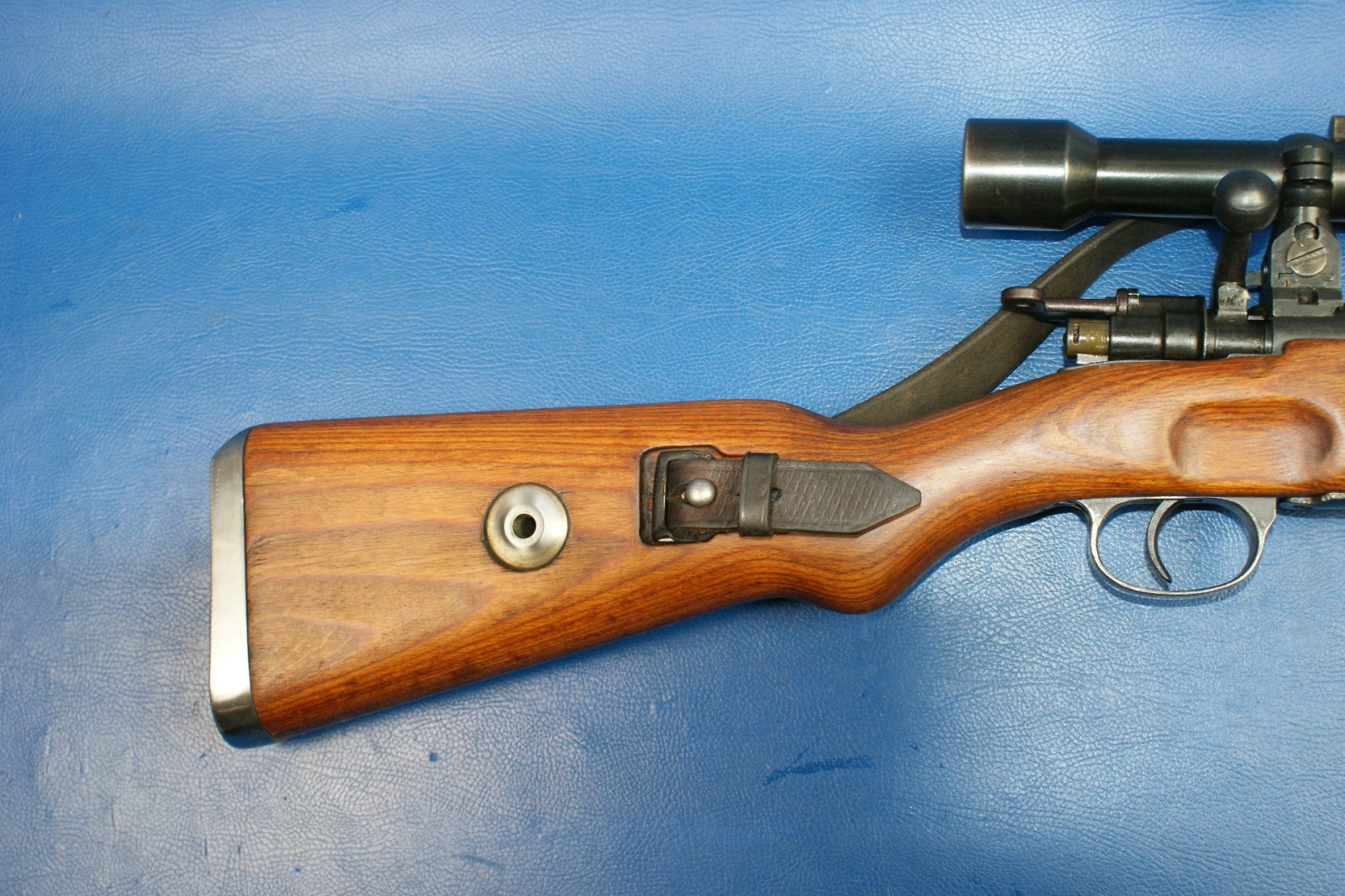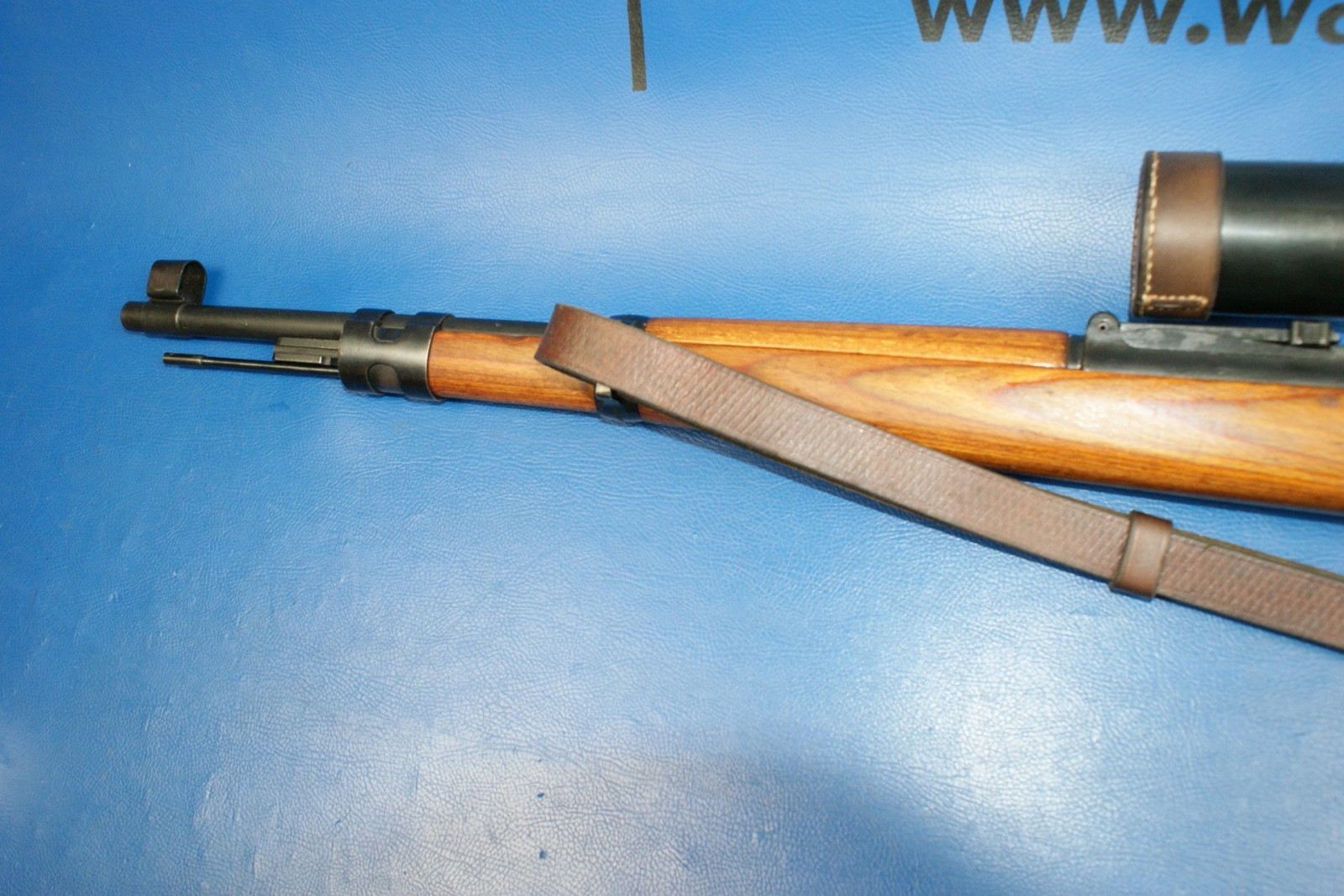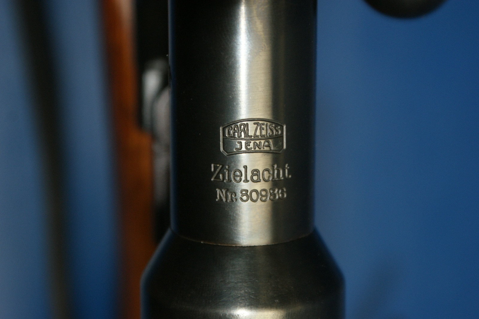 Zielfernrohr Carl Zeiss Jena, Zielacht, Nr. 30936, Absehen 4, Linsen klar; Schutzkappen für Zielfernrohr aus Leder; Visierschutz für Kimme aus Leder; Gewehrriemen Frosch bad 1942 gestempelt.