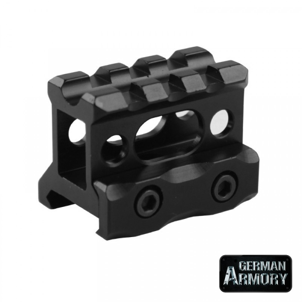 Wetterbeständiges, beschichtetes Aluminium (Schrauben aus Stahl), Schussfest und verlässlich. Optimal um die Visierlinie von Optiken um 26mm zu erhöhen.