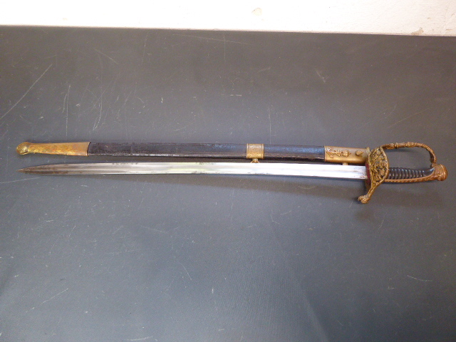Aus meiner Sammlung gebe ich, ein alten Französischen Originalen Marine Säbel mit Lederscheide Hersteller Klingenthal ab. Griff Horn, stark verziertes Gefäß aus Messing mit Floralen und Anker Muster. Einschneidige Klinge beidseitig mit einer breiten und schmalen Kehlung, noch zu erkennenden zwei kleine Punzen unterm roten Stoßleder, Rücken mit Hersteller Klingenthal, Klinge im unteren drittel Fleckig aber nicht Narbig. Scheide Leder mit drei stark ornamentierten Messingbeschläge, der mittlere Beschlag ist locker. Das Teil ist im Guten Sammelwürdigen Zustand. Alles andere entnehmen Sie Bitte den Fotos. Gesamtlänge: 85,5 cm, ohne Scheide: 82,5 cm, Klingenlänge: 68 cm, Klingenbreite: 2,7 cm. Kann zu jederzeit bei mir besichtigt werden. Privatauktion keine Rücknahme und Garantie.