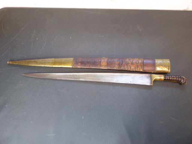 Aus meiner Sammlung gebe ich, ein altes Afghanisches Khyber Messer mit Scheide ab. Griff Hornschalen, eine Seite etwas abgesplittert, gefast in Messing Montierungen mit Ornamenten. Einschneidige breite T Klinge, beidseitig mit Eisenschnitt. Scheide Holz mit Leder ummantelt und zwei Messingbeschläge mit Ornamenten. Das Teil ist im Guten Sammelwürdigen Zustand. Alles andere entnehmen Sie Bitte den Fotos. Gesamtlänge: 82 cm, ohne Scheide: 72 cm, Klingenlänge: 58 cm, Klingenbreite: 4,9 cm. Kann zu jederzeit bei mir besichtigt werden. Privatauktion keine Rücknahme und Garantie.
